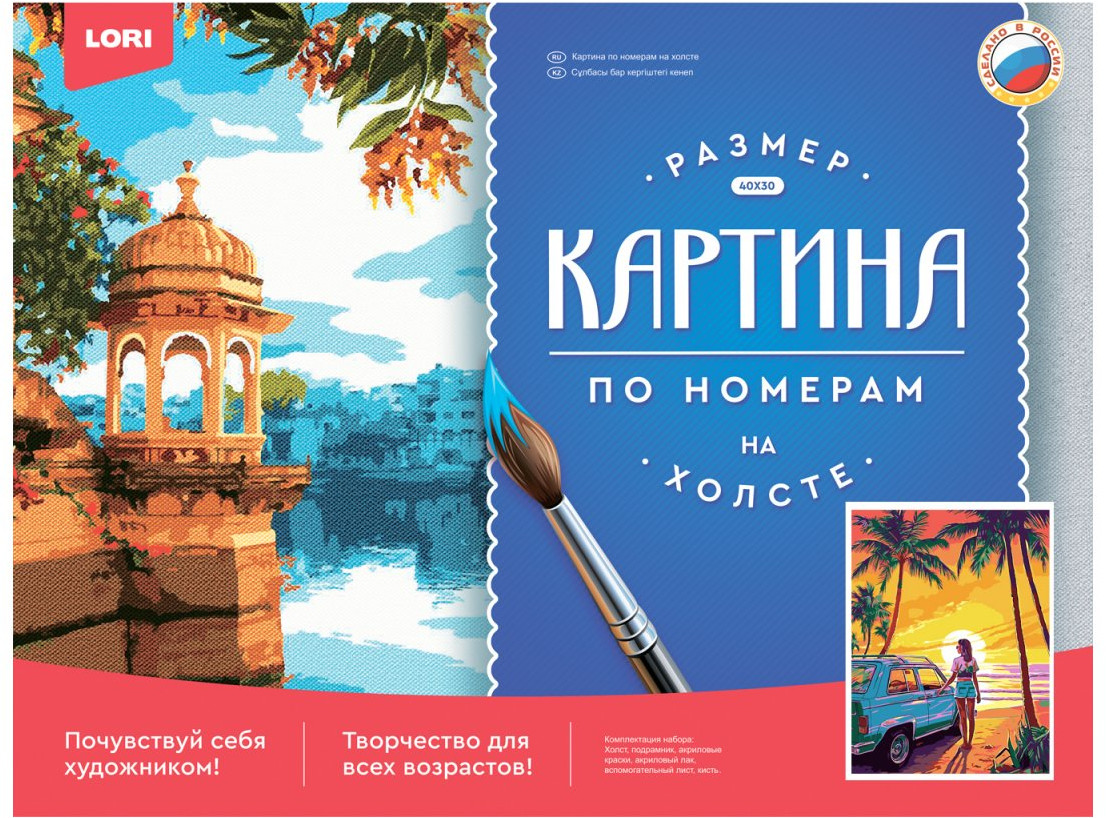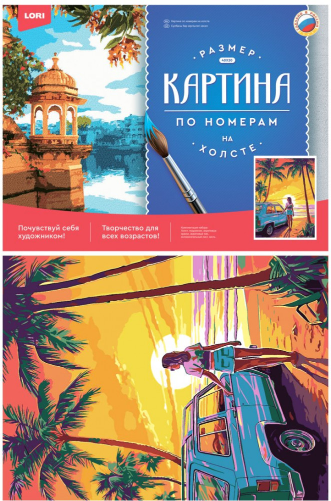 Комплектация: основа на холсте на подрамнике с контуром, акриловые краски, вспомогательный лист, акриловый лак.
