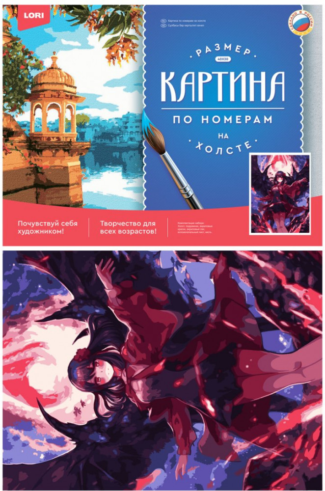 Комплектация: основа на холсте на подрамнике с контуром, акриловые краски, вспомогательный лист, акриловый лак.