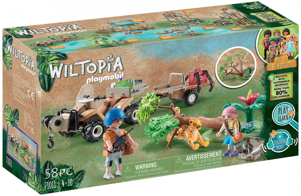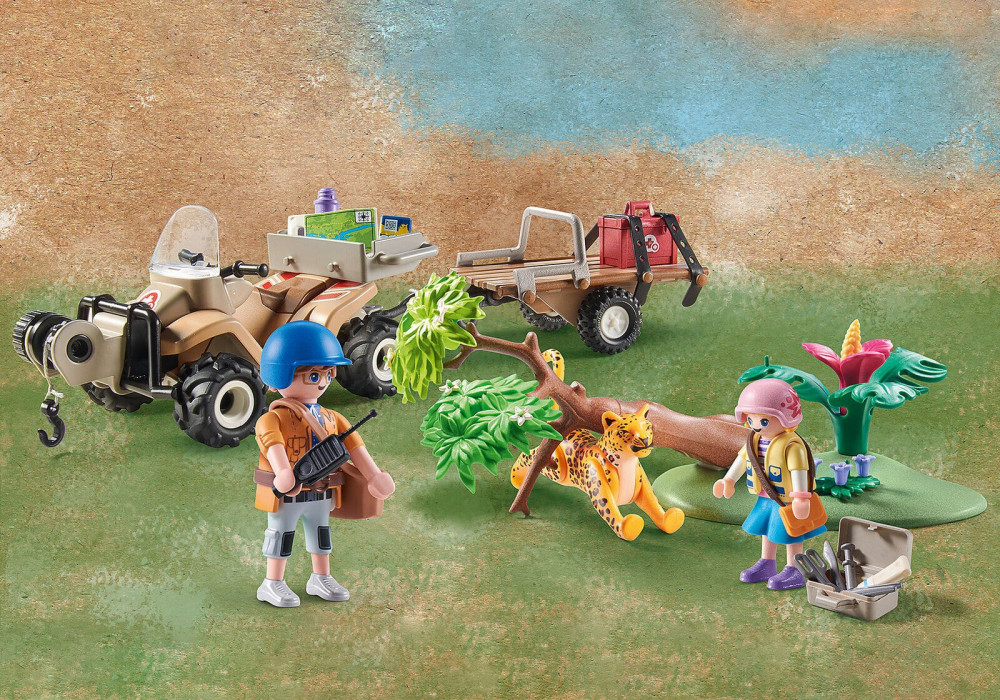 Квадроцикл для спасения домашних животных — это транспортное средство, на котором Лив и Джейми Палмер пробираются через джунгли, чтобы помочь дикой кошке, застрявшей под упавшим деревом. Ветеринар Джейми едет на квадроцикле, чтобы как можно быстрее добраться до нуждающегося животного. Ему помогает карта, без которой он мог бы заблудиться в дремучем лесу. У квадроцикла есть транспортный прицеп, который Палмеры используют для перевозки раненых животных в пункт оказания помощи. Джейми приносит раненого ягуара на станцию, чтобы вылечить кошку, а затем выпустить ее обратно в дикую природу. Транспортное средство — это скорая помощь и транспортное средство для животных в одном лице. С помощью лебедки квадроцикл может преодолевать препятствия на грязных тропах Амазонки. Помимо множества ветеринарных принадлежностей, в набор также входит лист наклеек с перевязочными этикетками для лечения животных. Дерево, прикрепленное к основанию, можно опрокинуть и переставить, чтобы разыграть любую историю.