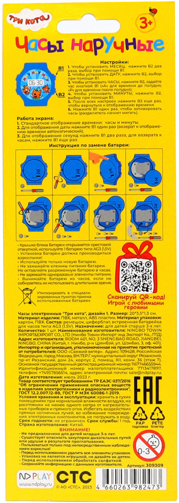 ND Play Часы наручные электронныеВ данный момент этот товар отсутствует в продаже. Возможно, у нас найдется аналогичный или похожий товар здесь. Серия: Три кота Часы наручные электронные для детей дошкольного и школьного возраста с героями мультфильма «Три кота». В комплектацию часов входит: ремешок, циферблат, встроенная батарейка для часов типа AG3 (1,5V). Оригинальные электронные детские часы. |