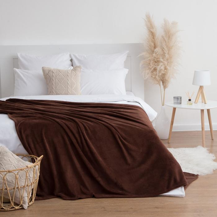 Приятная мягкая ткань. Красивый шоколадный цвет. Очень комфортный размер. Можно сложить вдвое и укрыться осенне-зимними вечерами.