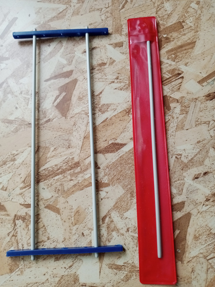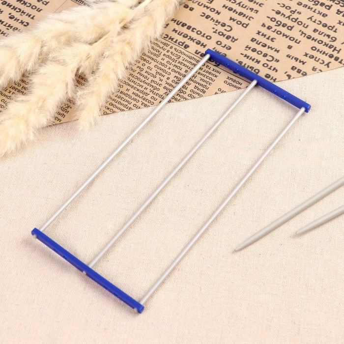 Отличная штука эта вилка! Состоит из 3х одинаковых спиц , длина каждой - 20 см, сечение/толщина - 3 мм. Между прочим, в других наборах спиц всего 2. Два пластиковых синих держателя / вверх и вниз/ - их длина только 9 см. В каждом по 7 отверстий. Это значит, полосы можно вязать шириной в 1см- 2- 3- 4- 5- 6- 6,5 и 8 см . Шире уже никак не получится . Зато ооочень лёгкая вилка и все спицы держит крепко - не болтаются в работе. Рекомендую. Особенно тем, кто уже умеет с ней работать . И самое главное - у этой вилки есть свой чехол, в котором очень удобно её хранить .