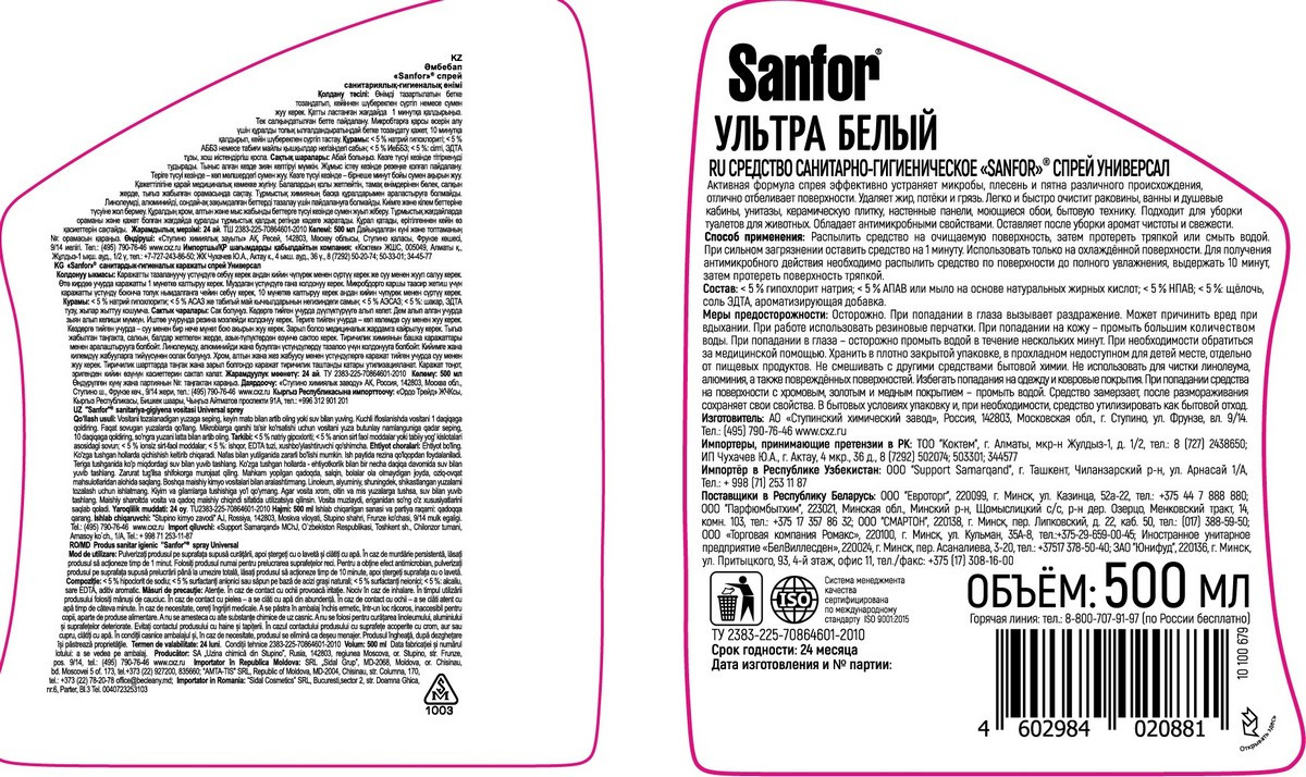 💳 Оплатить за товар можно при получении 🇰🇿 Есть бесплатная доставка по Казахстану от 1 дня 🎁 Копите бонусы с каждой покупки Sanfor средство санитарно гигиеническое спрей универсал ультра белый 500 мл. Активная формула спрея эффективно устраняет микробы, плесень и пятна различного происхождения, отлично отбеливает поверхности. Удаляет жир, потеки и грязь. Легко и быстро очистит раковины, ванны и душевые кабины, унитазы, керамическую плитку, настенные панели, моющиеся обои, бытовую технику. Подходит для уборки туалетов для животных. Обладает антимикробными свойствами. Оставляет после уборки аромат чистоты и свежести. |