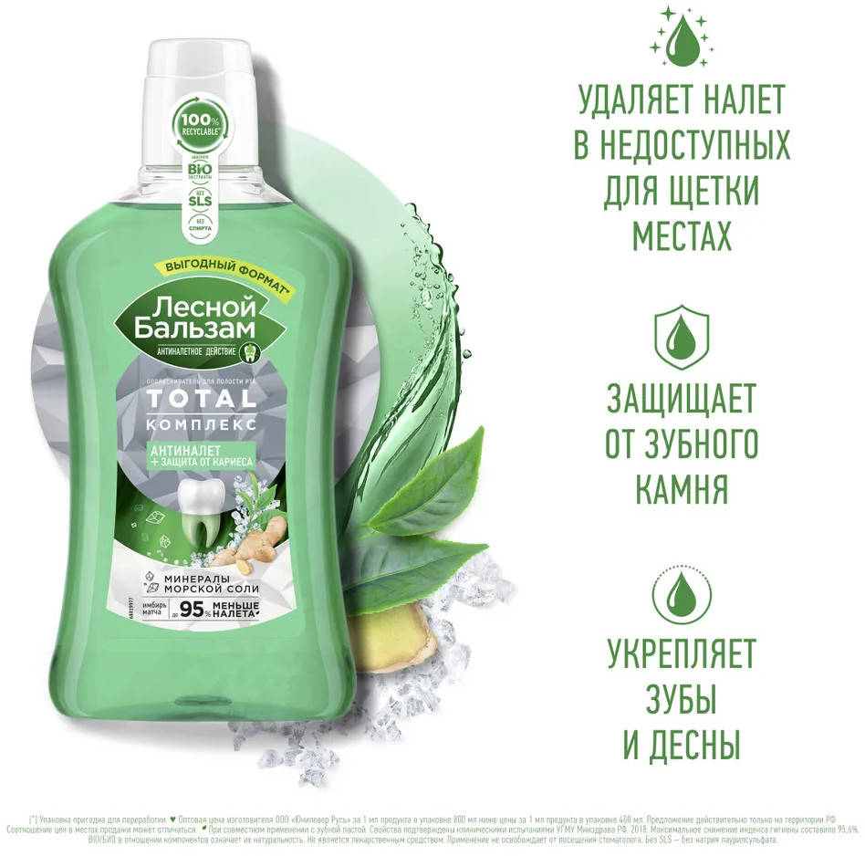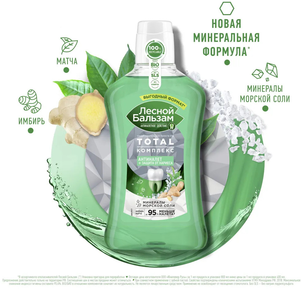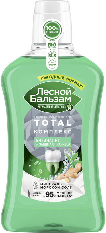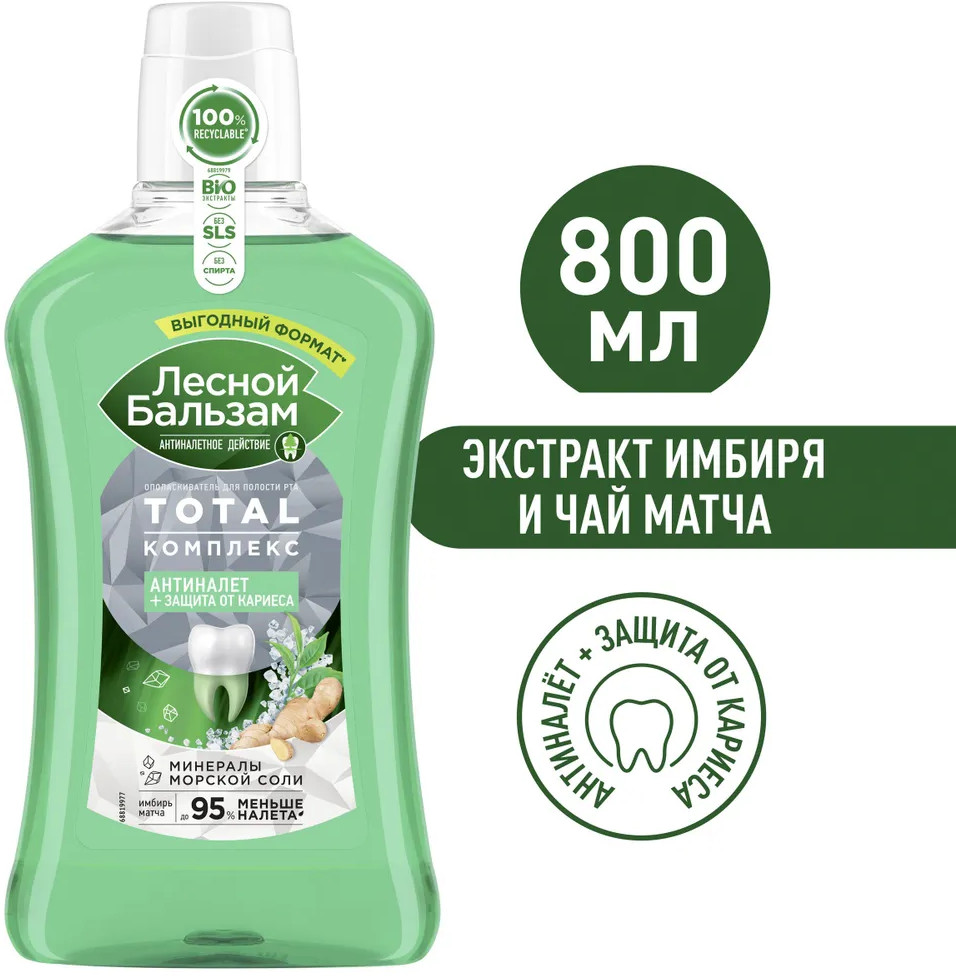 Лесной бальзам Ополаскиватель для полости рта с морской солью, экстрактом имбиря и чаем матча «Антиналёт и защита от кариеса»