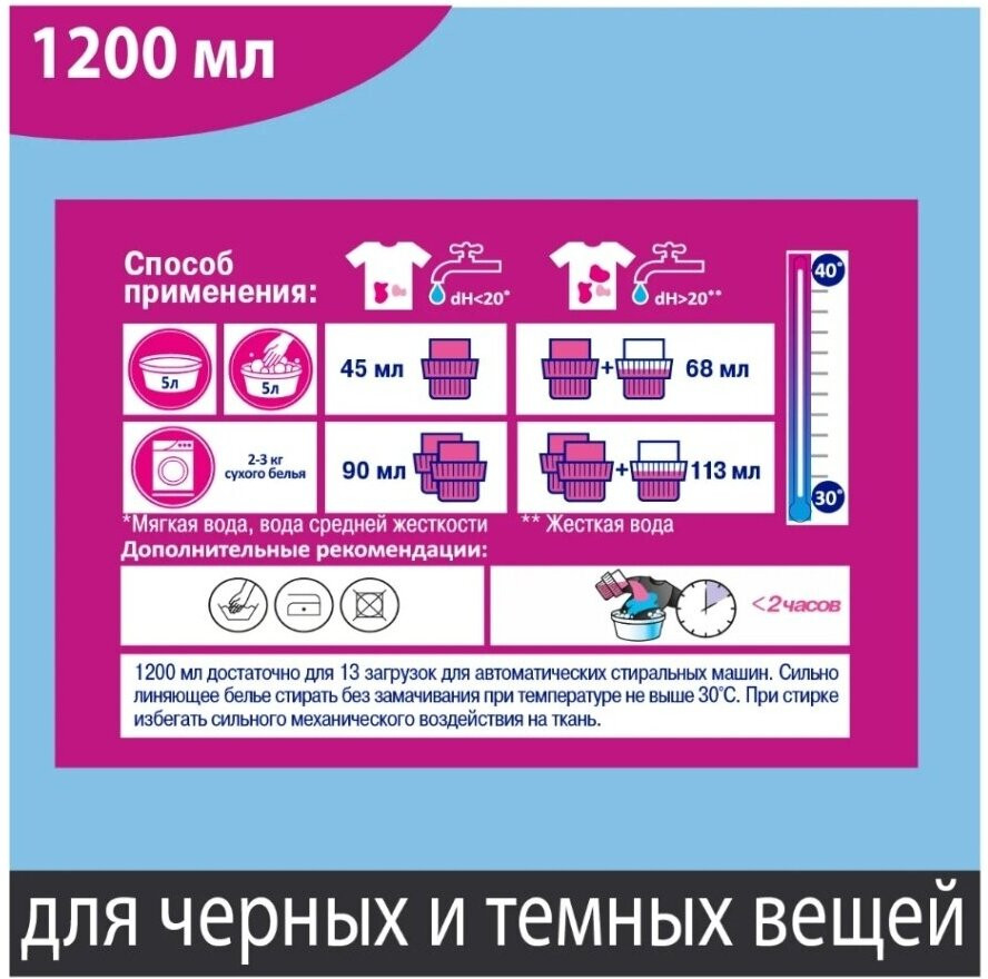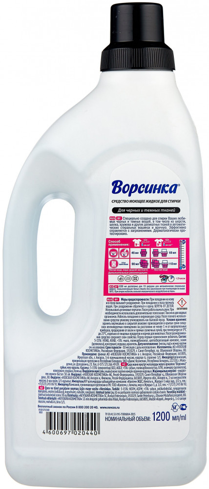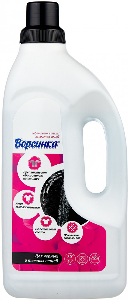 Благодаря жидкой форме отлично растворяется в воде, без остатка выполаскивается с ткани и обеспечивает более бережное воздействие на ткань. Формула средства позволяет стирать не только синтетические вещи и вещи из хлопка, но и изделия, требующие особо бережной стирки, такие как шерсть, шелк, кружево, вискоза, бархат и другие. Жидкое средство для стирки черных и темных вещей «Ворсинка» дерматологически протестировано. Средство не содержит хлора, фосфатов. Отдушка не содержит аллергенов. Средство подходит для всей семьи. Благодаря специальным добавкам, стирать можно в воде любой жесткости.
