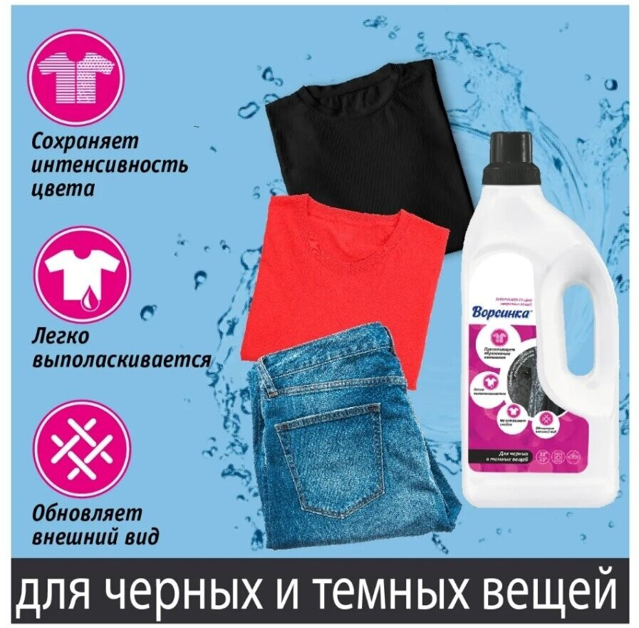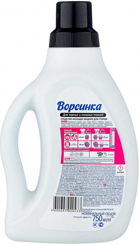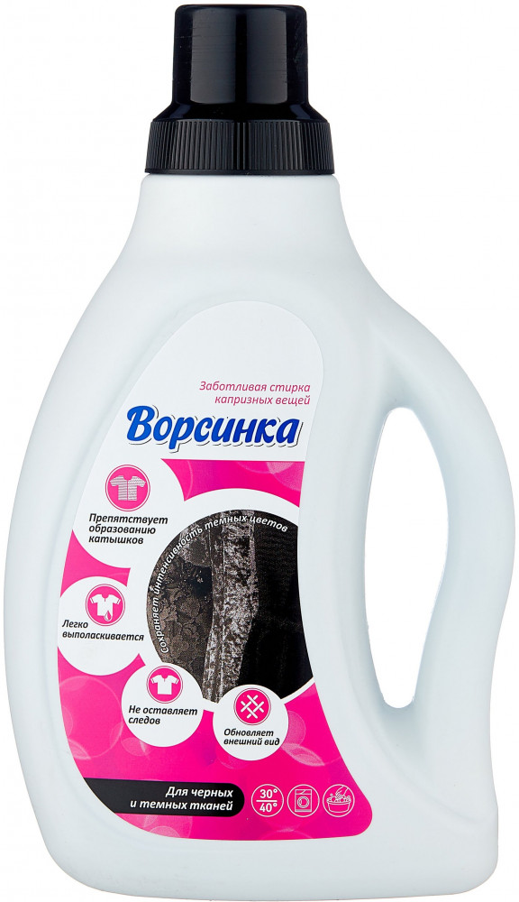 Благодаря жидкой форме отлично растворяется в воде, без остатка выполаскивается с ткани и обеспечивает более бережное воздействие на ткань. Формула средства позволяет стирать не только синтетические вещи и вещи из хлопка, но и изделия, требующие особо бережной стирки, такие как шерсть, шелк, кружево, вискоза, бархат и другие. Жидкое средство для стирки черных и темных вещей «Ворсинка» дерматологически протестировано. Средство не содержит хлора, фосфатов. Отдушка не содержит аллергенов. Средство подходит для всей семьи. Благодаря специальным добавкам, стирать можно в воде любой жесткости.