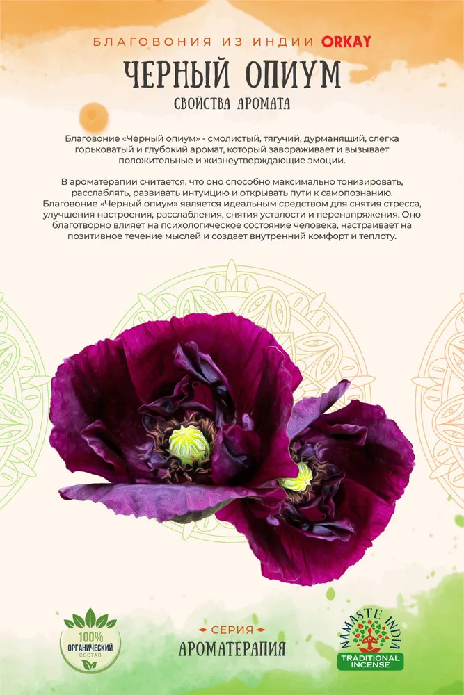 запах спокойный и задумчивый. в начале как открыли пачку, очень насыщенный оказался запах палочек. но в процессе горения,просто расслабляющий.лишь думал,что пачули немного по другому пахнет...