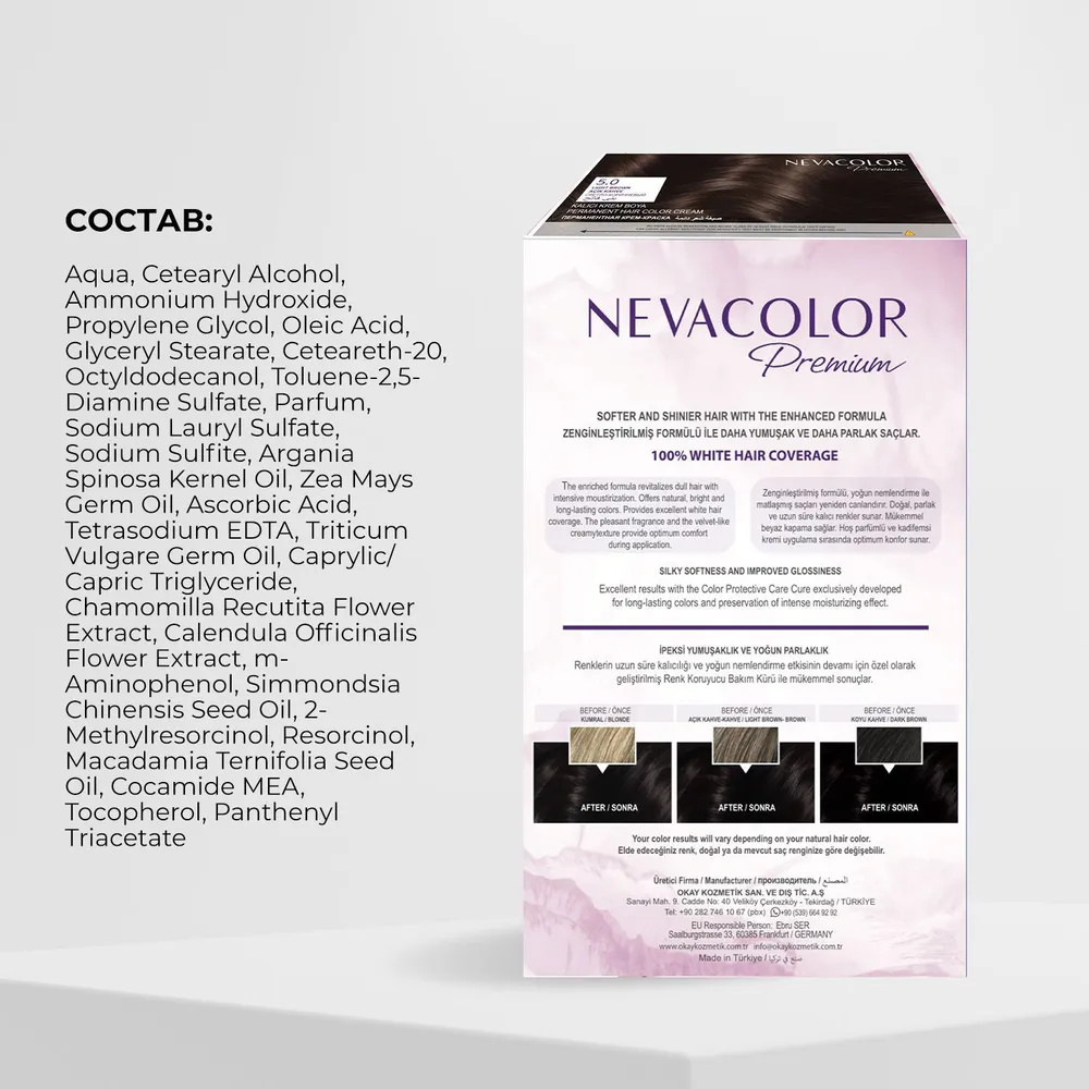 Стойкая крем-краска для волос Nevacolor Premium разработана с учетом профессиональных технологий стойкого окрашивания: обеспечивает сияющий цвет от корней до кончиков. До 100% закрашивания седины. Нежная текстура обволакивает каждый волос, глубоко проникает и красит в насыщенный оттенок. Уникальный состав обогащен ухаживающими маслами, экстрактами и витаминами. Масла арганы и жожоба восстанавливают после процедуры. Макадамия смягчает, питает витаминами B, E, A. Кукуруза и ростки пшеницы предотвращают сухость, интенсивно увлажняют. Ромашка и календула снижают агрессивное воздействие, придают прядям объем и шелковистость. Гидролизированные протеины препятствуют обезвоживанию, укрепляют структуру прядей.