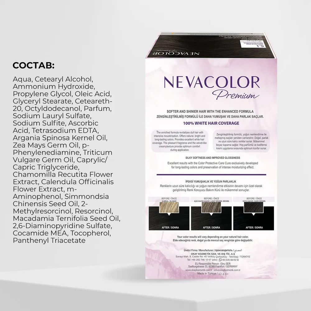 Стойкая крем-краска для волос Nevacolor Premium разработана с учетом профессиональных технологий стойкого окрашивания: обеспечивает сияющий цвет от корней до кончиков. До 100% закрашивания седины. Нежная текстура обволакивает каждый волос, глубоко проникает и красит в насыщенный оттенок. Уникальный состав обогащен ухаживающими маслами, экстрактами и витаминами. Масла арганы и жожоба восстанавливают после процедуры. Макадамия смягчает, питает витаминами B, E, A. Кукуруза и ростки пшеницы предотвращают сухость, интенсивно увлажняют. Ромашка и календула снижают агрессивное воздействие, придают прядям объем и шелковистость. Гидролизированные протеины препятствуют обезвоживанию, укрепляют структуру прядей.