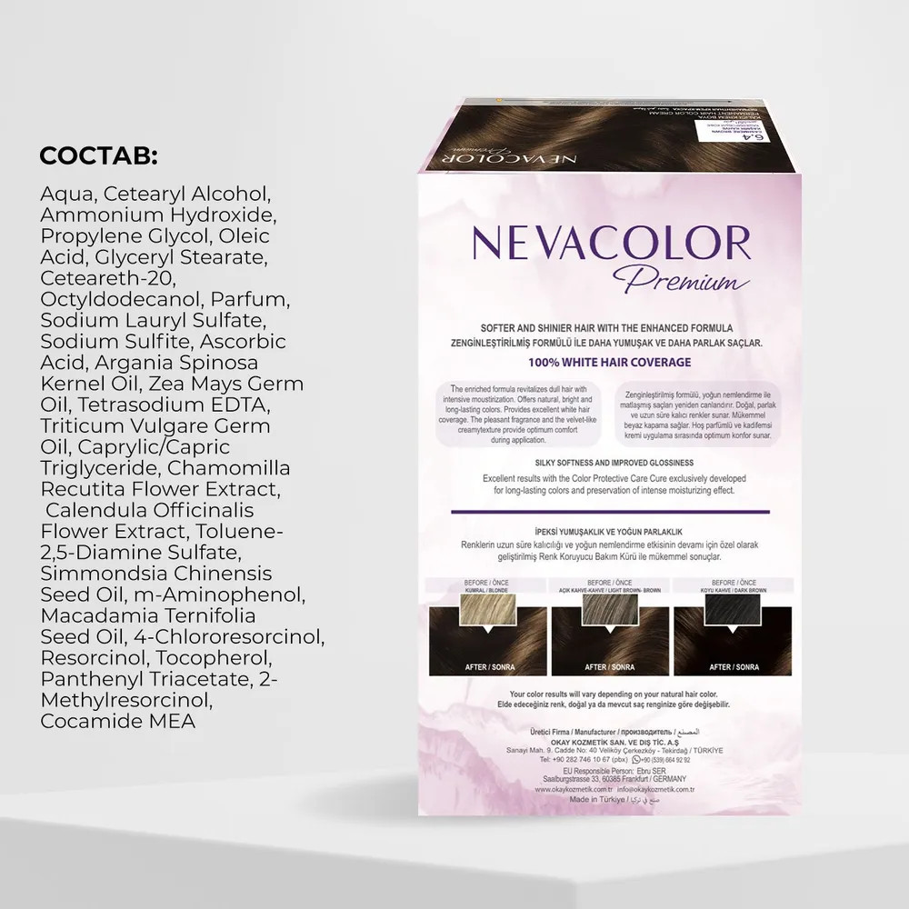 Стойкая крем-краска для волос Nevacolor Premium разработана с учетом профессиональных технологий стойкого окрашивания: обеспечивает сияющий цвет от корней до кончиков. До 100% закрашивания седины. Нежная текстура обволакивает каждый волос, глубоко проникает и красит в насыщенный оттенок. Уникальный состав обогащен ухаживающими маслами, экстрактами и витаминами. Масла арганы и жожоба восстанавливают после процедуры. Макадамия смягчает, питает витаминами B, E, A. Кукуруза и ростки пшеницы предотвращают сухость, интенсивно увлажняют. Ромашка и календула снижают агрессивное воздействие, придают прядям объем и шелковистость. Гидролизированные протеины препятствуют обезвоживанию, укрепляют структуру прядей.