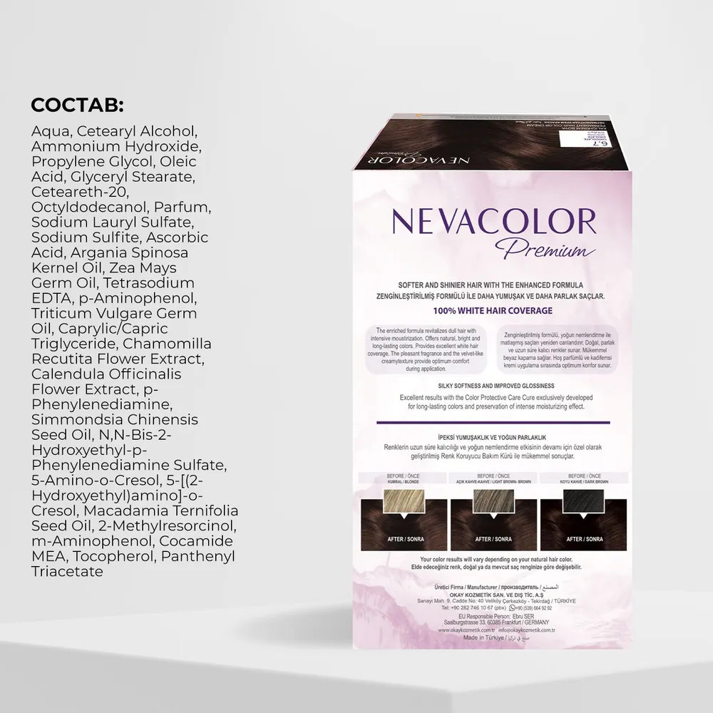 Стойкая крем-краска для волос Nevacolor Premium разработана с учетом профессиональных технологий стойкого окрашивания: обеспечивает сияющий цвет от корней до кончиков. До 100% закрашивания седины. Нежная текстура обволакивает каждый волос, глубоко проникает и красит в насыщенный оттенок. Уникальный состав обогащен ухаживающими маслами, экстрактами и витаминами. Масла арганы и жожоба восстанавливают после процедуры. Макадамия смягчает, питает витаминами B, E, A. Кукуруза и ростки пшеницы предотвращают сухость, интенсивно увлажняют. Ромашка и календула снижают агрессивное воздействие, придают прядям объем и шелковистость. Гидролизированные протеины препятствуют обезвоживанию, укрепляют структуру прядей.