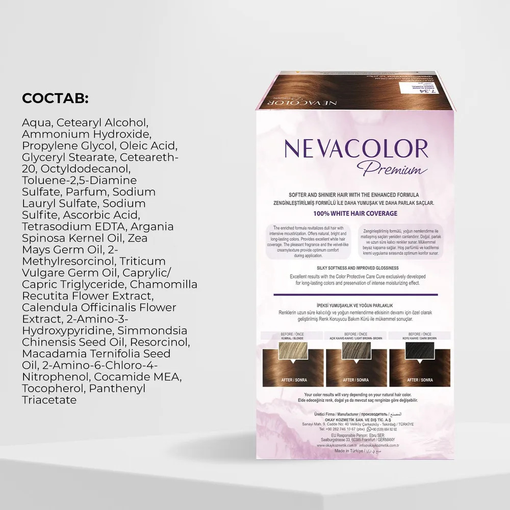 Стойкая крем-краска для волос Nevacolor Premium разработана с учетом профессиональных технологий стойкого окрашивания: обеспечивает сияющий цвет от корней до кончиков. До 100% закрашивания седины. Нежная текстура обволакивает каждый волос, глубоко проникает и красит в насыщенный оттенок. Уникальный состав обогащен ухаживающими маслами, экстрактами и витаминами. Масла арганы и жожоба восстанавливают после процедуры. Макадамия смягчает, питает витаминами B, E, A. Кукуруза и ростки пшеницы предотвращают сухость, интенсивно увлажняют. Ромашка и календула снижают агрессивное воздействие, придают прядям объем и шелковистость. Гидролизированные протеины препятствуют обезвоживанию, укрепляют структуру прядей.