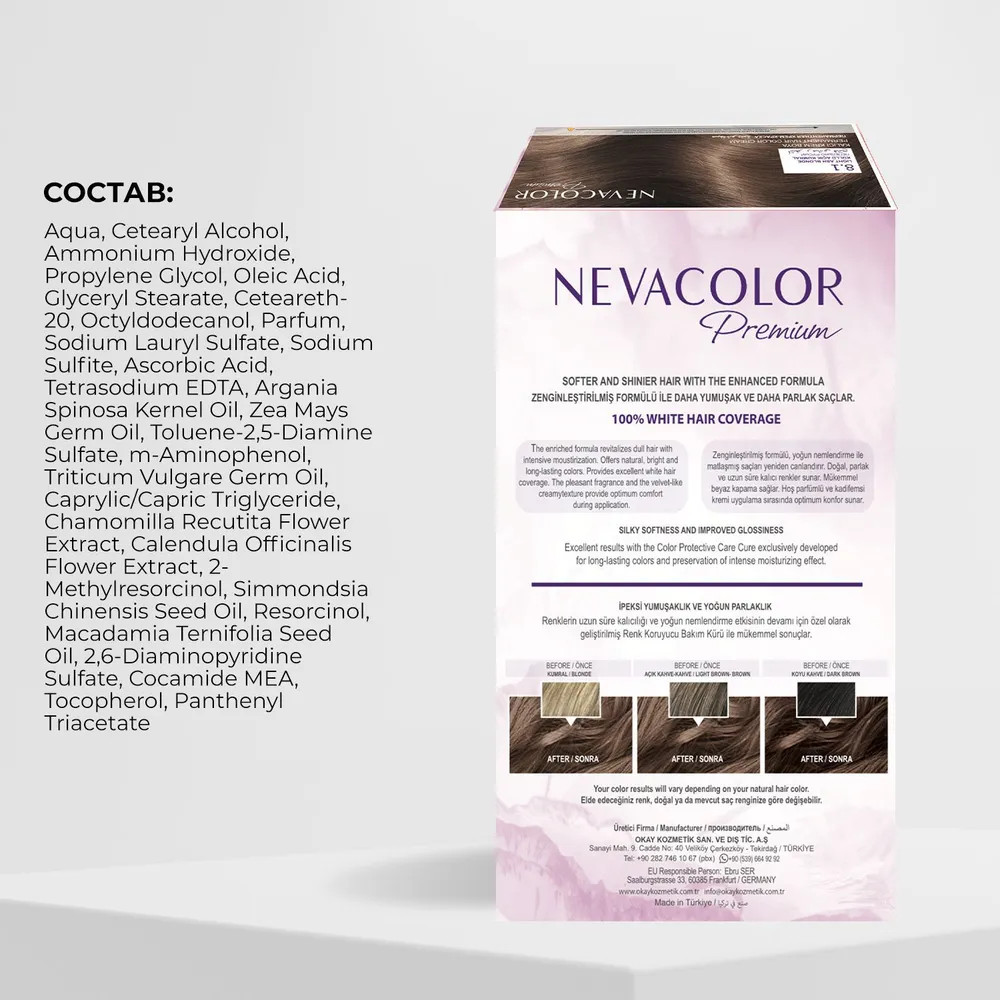 Стойкая крем-краска для волос Nevacolor Premium разработана с учетом профессиональных технологий стойкого окрашивания: обеспечивает сияющий цвет от корней до кончиков. До 100% закрашивания седины. Нежная текстура обволакивает каждый волос, глубоко проникает и красит в насыщенный оттенок. Уникальный состав обогащен ухаживающими маслами, экстрактами и витаминами. Масла арганы и жожоба восстанавливают после процедуры. Макадамия смягчает, питает витаминами B, E, A. Кукуруза и ростки пшеницы предотвращают сухость, интенсивно увлажняют. Ромашка и календула снижают агрессивное воздействие, придают прядям объем и шелковистость. Гидролизированные протеины препятствуют обезвоживанию, укрепляют структуру прядей.