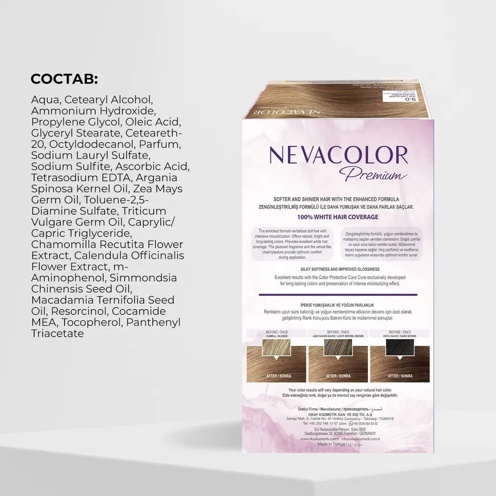 Стойкая крем-краска для волос Nevacolor Premium разработана с учетом профессиональных технологий стойкого окрашивания: обеспечивает сияющий цвет от корней до кончиков. До 100% закрашивания седины. Нежная текстура обволакивает каждый волос, глубоко проникает и красит в насыщенный оттенок. Уникальный состав обогащен ухаживающими маслами, экстрактами и витаминами. Масла арганы и жожоба восстанавливают после процедуры. Макадамия смягчает, питает витаминами B, E, A. Кукуруза и ростки пшеницы предотвращают сухость, интенсивно увлажняют. Ромашка и календула снижают агрессивное воздействие, придают прядям объем и шелковистость. Гидролизированные протеины препятствуют обезвоживанию, укрепляют структуру прядей.