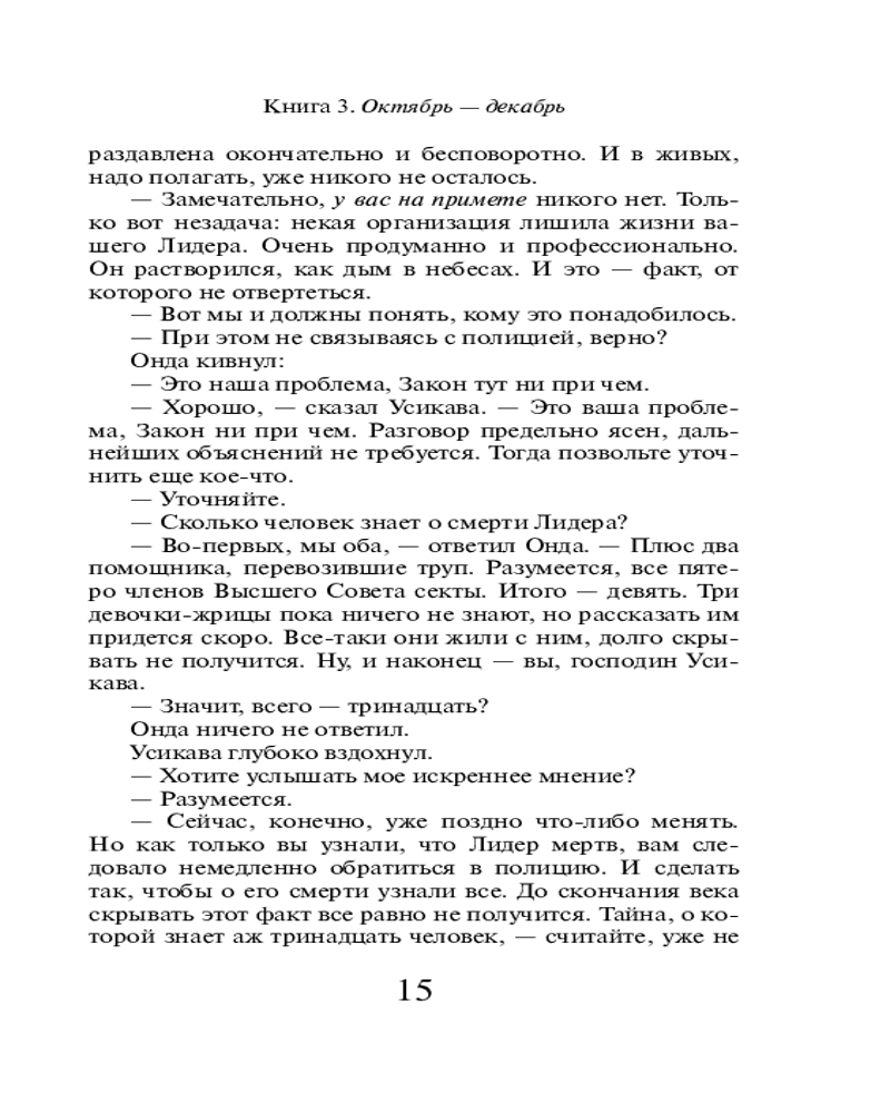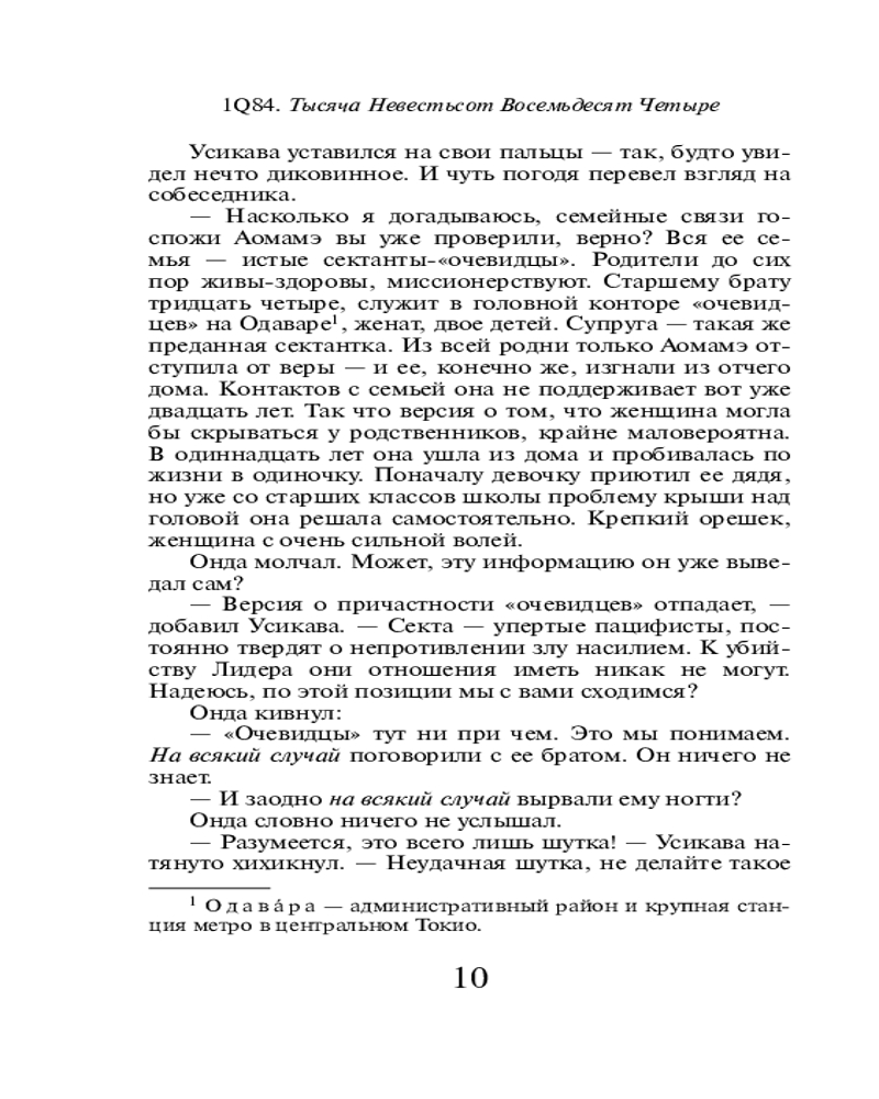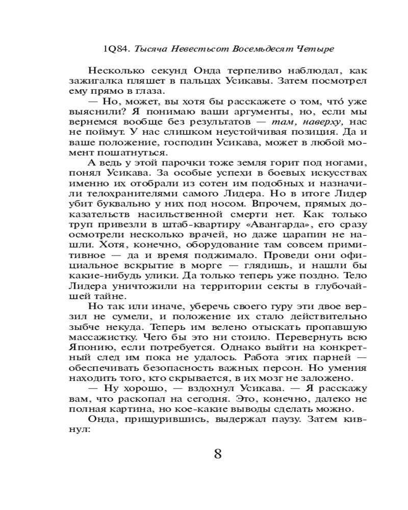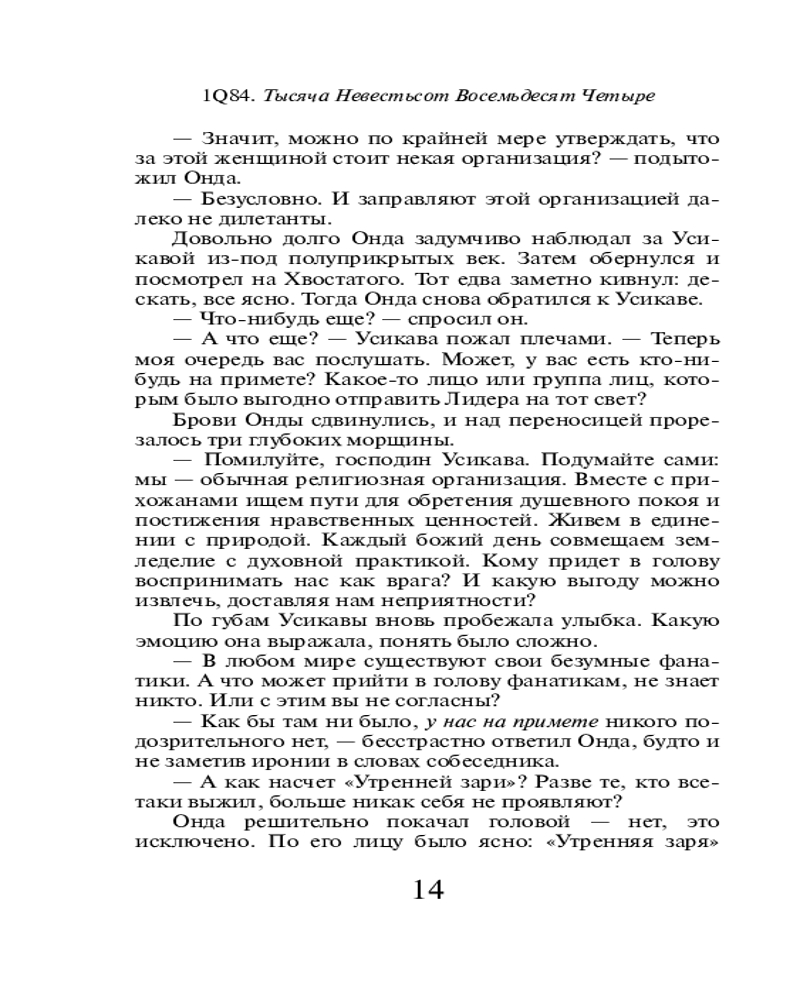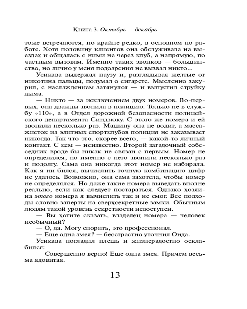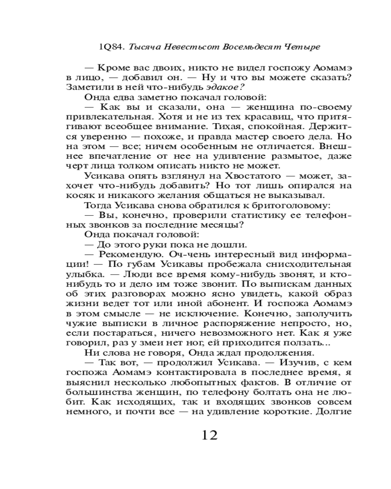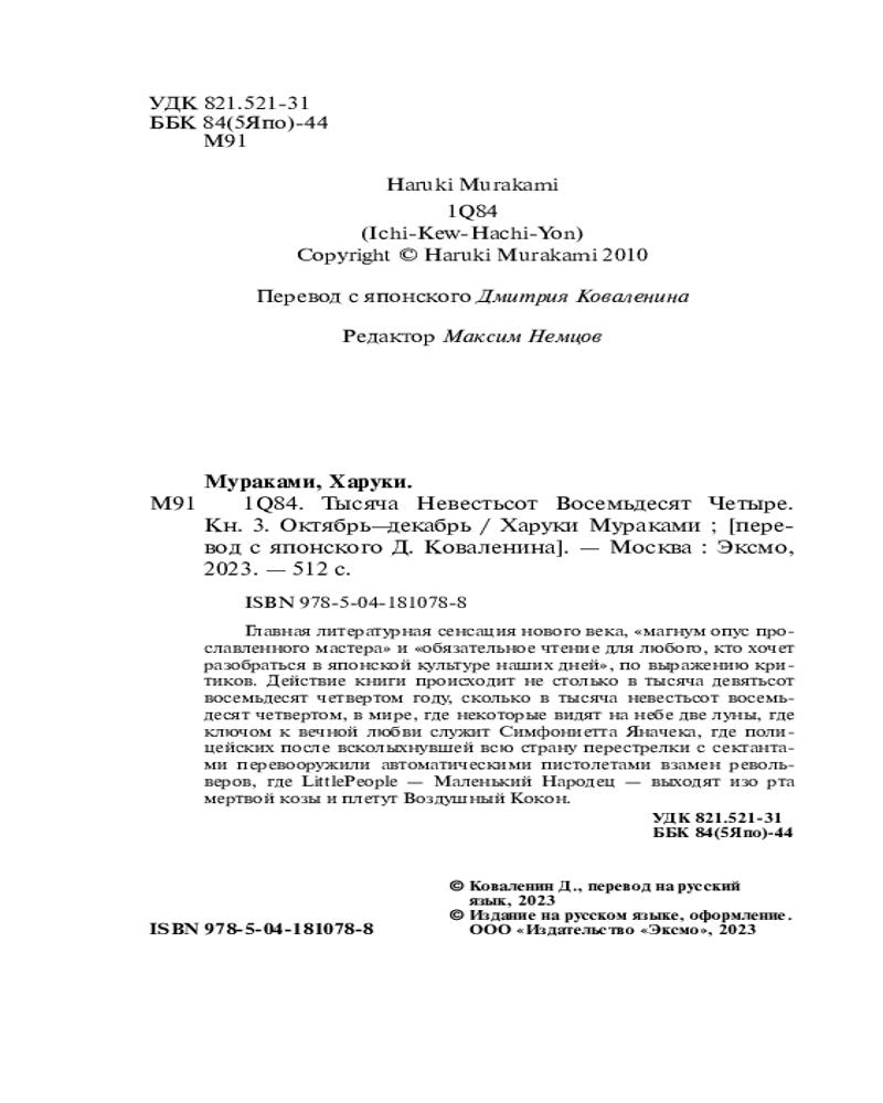 💳 Оплатить за товар можно при получении 🇰🇿 Есть бесплатная доставка по Казахстану от 1 дня 🎁 Копите бонусы с каждой покупки Серия: Миры Харуки Мураками Третья книга романа «1Q84» от мастера современной прозы Харуки Мураками. Где же ты ходишь, Тэнго? Скорее найди меня. Пока этого не сделал кто-нибудь другой. Однако на дворе — Тысяча Невестьсот Восемьдесят Четвертый год. В котором может случиться все, что угодно. Этот мир, в котором светят две луны, мы называли каждый по-своему, думает Аомамэ. У меня он «1Q84», у него — «Кошачий город». В него мы прибыли, чтобы встретиться. |