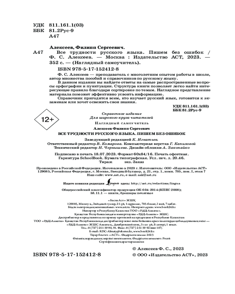 💳 Оплатить за товар можно при получении 🇰🇿 Есть бесплатная доставка по Казахстану от 1 дня 🎁 Копите бонусы с каждой покупки Серия: Наглядный самоучитель Ф. С. Алексеев — преподаватель с многолетним опытом работы в школе, автор множества пособий и справочников по русскому языку. |
