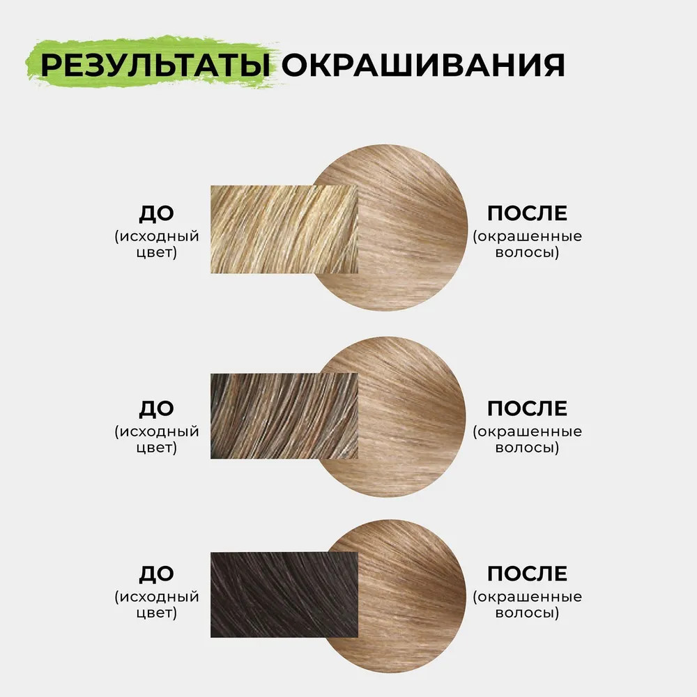 Неплохо выравнивает тон. Одной пачки хватает на короткие волосы. Для длинных волос лучше взять пару-тройку упаковок.