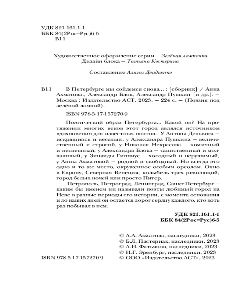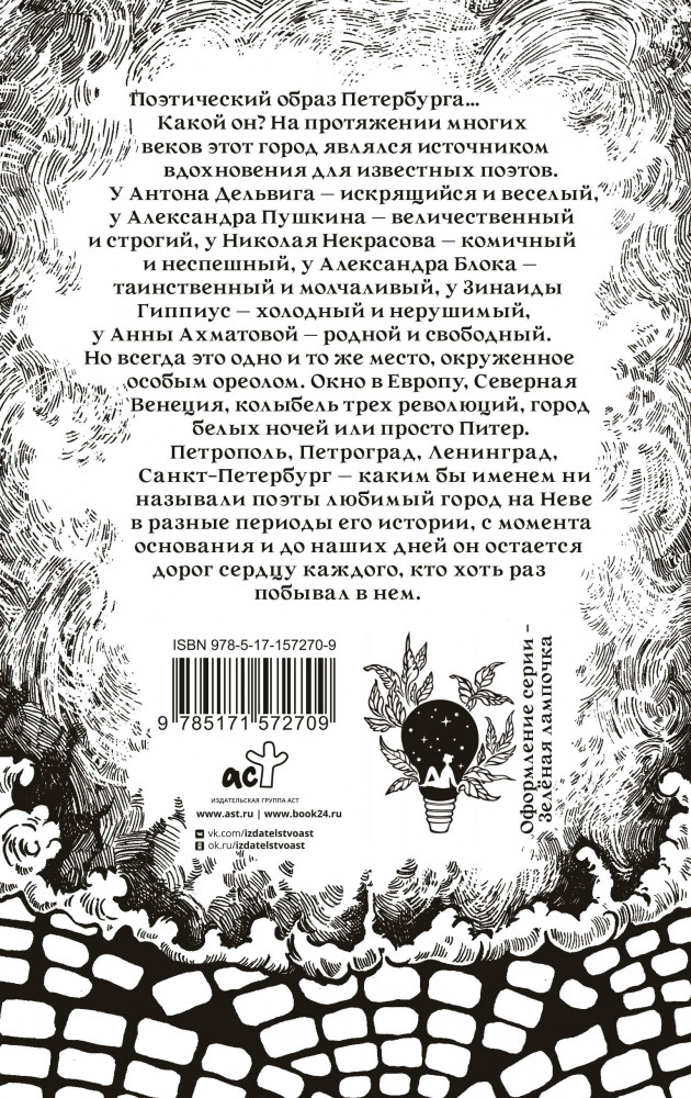 💳 Оплатить за товар можно при получении 🇰🇿 Есть бесплатная доставка по Казахстану от 1 дня 🎁 Копите бонусы с каждой покупки Серия: Поэзия под зелёной лампой Поэтический образ Петербурга... Какой он? На протяжении многих веков этот город являлся источником вдохновения для известных поэтов. У Антона Дельвига — искрящийся и веселый, у Александра Пушкина — величественный и строгий, у Николая Некрасова — комичный и неспешный, у Александра Блока — таинственный и молчаливый, у Зинаиды Гиппиус —холодный и нерушимый, у Анны Ахматовой — родной и свободный. Но всегда это одно и то же место, окруженное особым ореолом. Окно в Европу, Северная Венеция, колыбель трех революций, город белых ночей или просто Питер. |