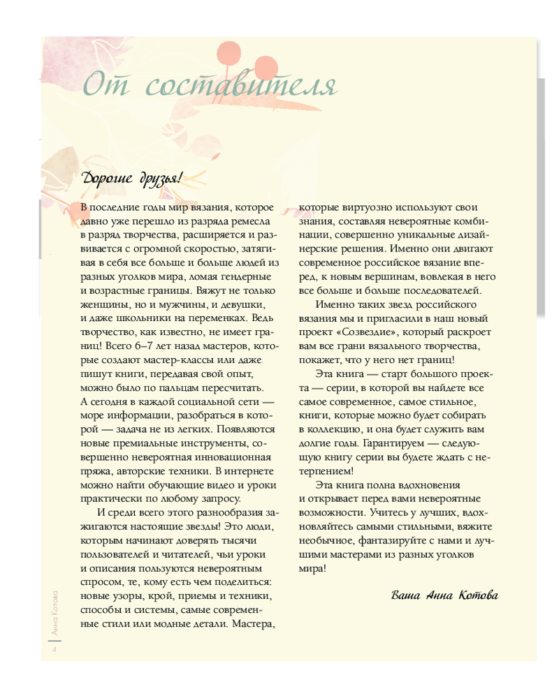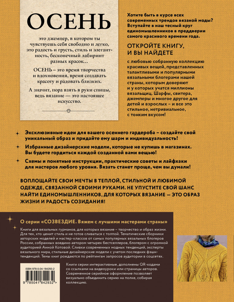 💳 Оплатить за товар можно при получении 🇰🇿 Есть бесплатная доставка по Казахстану от 1 дня 🎁 Копите бонусы с каждой покупки Серия: Созвездие. Вяжем с лучшими мастерами страны Уникальная книга в уникальной серии! Впервые авторские вязальные проекты от лучших мастеров России тщательно отобраны авторитетным экспертом, мастером, автором бестселлеров по вязанию Анной Котовой и представлены в одной книге! Самые авторитетные мастера-блогеры, чье имя на слуху российских и не только мастериц-вязальщиц, по чьим мастер-классам обучаются вязать тысячи и тысячи учеников во всем мире, предоставили свои роскошные авторские модели в эту красивую осеннюю книгу. |
