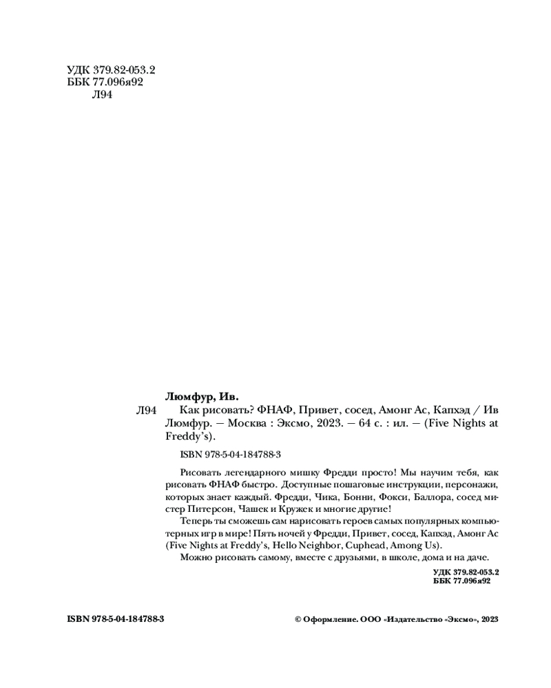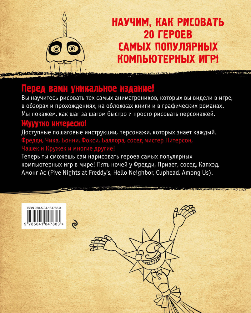 Как рисовать? ФНАФ, Привет, сосед, Амонг Ас, КапхэдВ данный момент этот товар отсутствует в продаже. Возможно, у нас найдется аналогичный или похожий товар здесь. Серия: Five Nights at Freddy's Рисовать легендарного мишку Фредди просто! Мы научим тебя, как рисовать ФНАФ быстро. Доступные пошаговые инструкции, персонажи, которых знает каждый. Фредди, Чика, Бонни, Фокси, Баллора, сосед мистер Питерсон, Чашек и Кружек и многие другие! Теперь ты сможешь сам нарисовать героев самых популярных компьютерных игр в мире! «Пять ночей у Фредди», «Привет, сосед!», «Капхэд», «Амонг Ас» (Five Nights at Freddy’s, Hello Neighbor, Cuphead, Among Us). Можно рисовать самому, вместе с друзьями, в школе, дома и на даче. Эта книга поможет скрасить время ожидания новинок бестселлеров по Five Nights at Freddy’s! |
