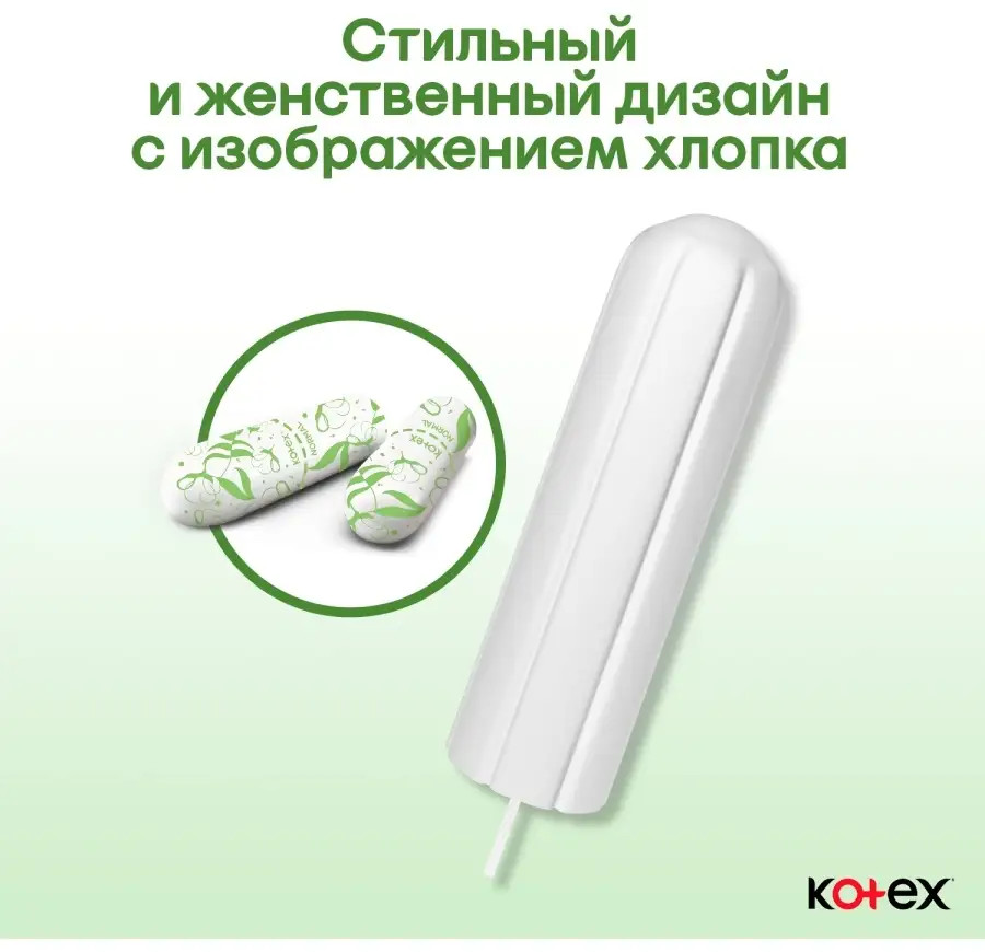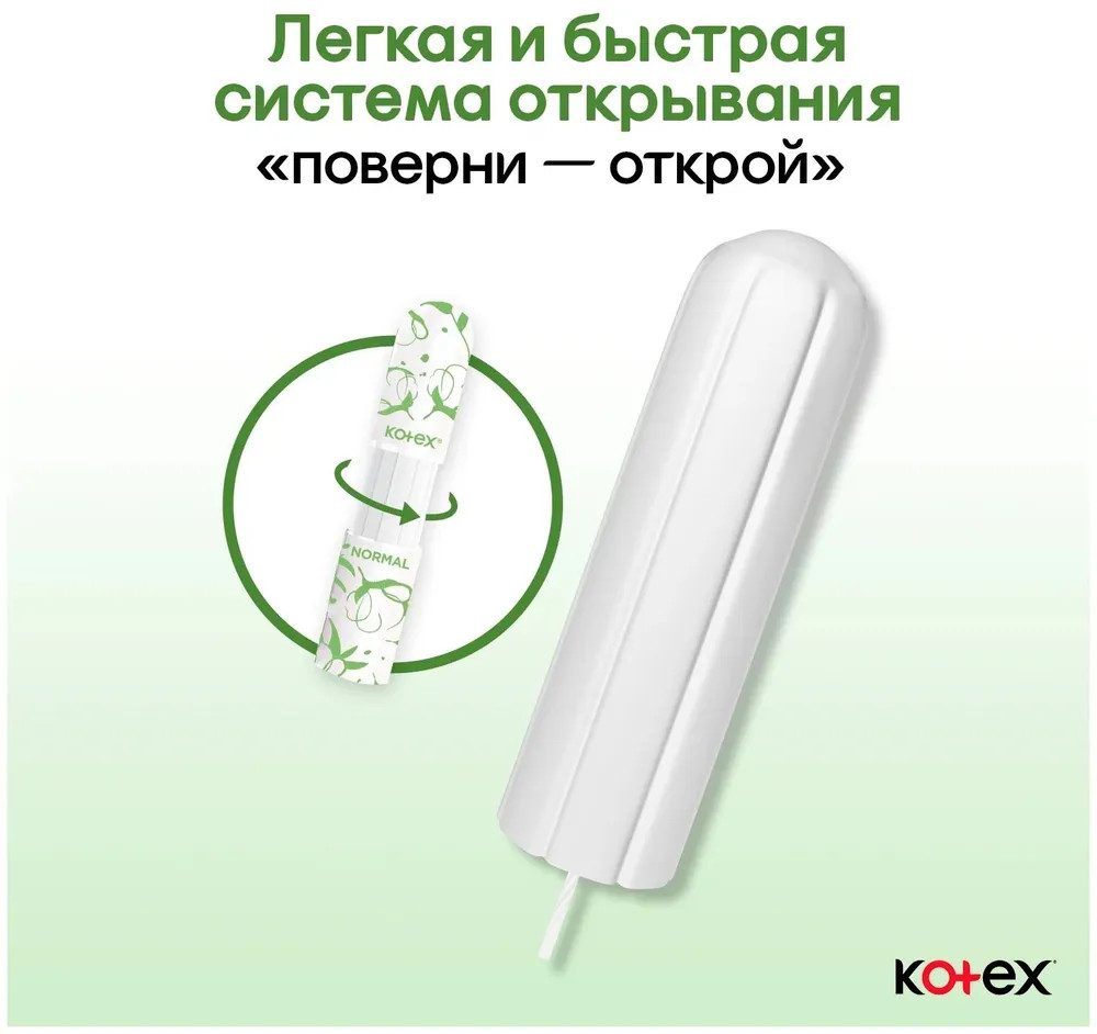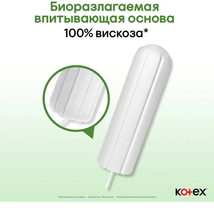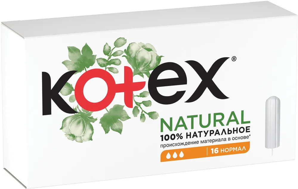 Женские гигиенические тампоны Kotex Natural Нормал — одно из самых удобных, практичных и гигиеничных средств защиты во время критических дней. Новые тампоны Kotex Natural Нормал созданы специально для потребностей современных девушек, которые не только хотят быть уверены в своей защите, но и во всём стремятся к натуральности: благодаря 100% натуральному происхождению материала в основе тампона. Новые тампоны Kotex Natural помогут вам заботиться о своём здоровье и сохранять ощущение уверенности и комфорта в течение всего дня. Тампоны Котекс Natural Нормал созданы для использования во время умеренных выделений. Каждый тампон упакован в индивидуальный пауч, который удобно брать с собой — поместится даже в самой маленькой сумочке, а нежный женственный дизайн с изображением хлопка добавит удовольствия при использовании. Кроме того, благодаря уникальному механизму «поверни и открой» тампоны максимально просты, гигиеничны и удобны в использовании. Материал впитывающей основы тампона — вискоза. Исходное сырье для производства вискозы — древесина.