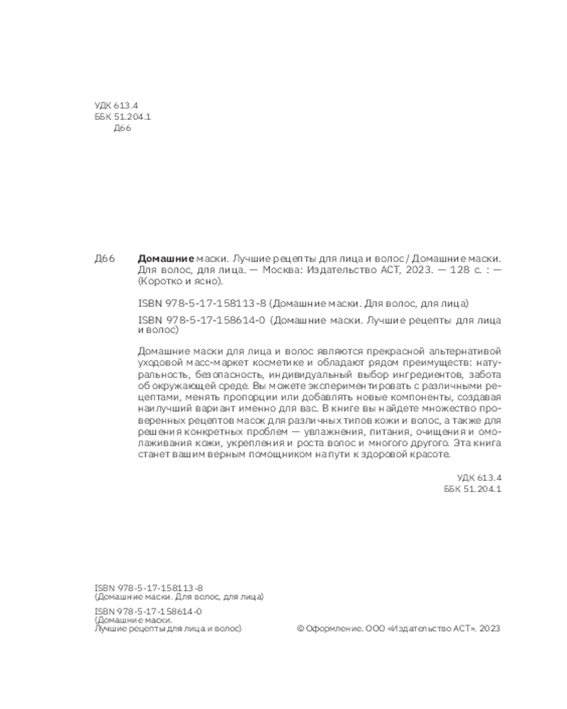 💳 Оплатить за товар можно при получении 🇰🇿 Есть бесплатная доставка по Казахстану от 1 дня 🎁 Копите бонусы с каждой покупки Серия: Коротко и ясно Домашние маски для лица и волос являются прекрасной альтернативой уходовой масс-маркет косметике и обладают рядом преимуществ: натуральность, безопасность, индивидуальный выбор ингредиентов, забота об окружающей среде. Вы можете экспериментировать с различными рецептами, менять пропорции или добавлять новые компоненты, создавая наилучший вариант именно для вас. В книге вы найдете множество проверенных рецептов масок для различных типов кожи и волос, а также для решения конкретных проблем — увлажнения, питания, очищения и омолаживания кожи, укрепления и роста волос и многого другого. Эта книга станет вашим верным помощником на пути к здоровой красоте. |