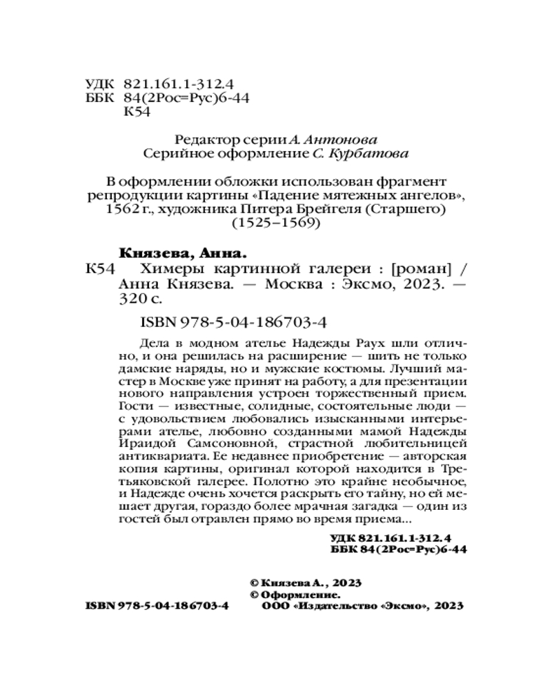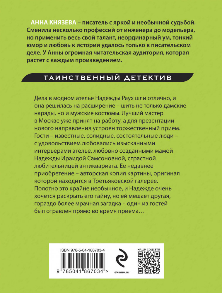 Химеры картинной галереиВ данный момент этот товар отсутствует в продаже. Возможно, у нас найдется аналогичный или похожий товар здесь. Серия: Таинственный детектив Анны Князевой. Новое оформление (обложка) Дела в модном ателье Надежды Раух шли отлично, и она решилась на расширение — шить не только дамские наряды, но и мужские костюмы. Лучший мастер в Москве уже принят на работу, а для презентации нового направления устроен торжественный прием. Гости — известные, солидные, состоятельные люди — с удовольствием любовались изысканными интерьерами ателье, любовно созданными мамой Надежды Ираидой Самсоновной, страстной любительницей антиквариата. Ее недавнее приобретение — авторская копия картины, оригинал которой находится в Третьяковской галерее. Полотно это крайне необычное, и Надежде очень хочется раскрыть его тайну, но ей мешает другая, гораздо более мрачная загадка — один из гостей был отравлен прямо во время приема... |