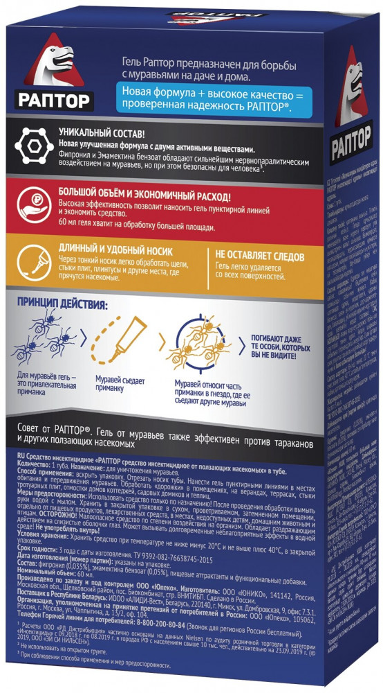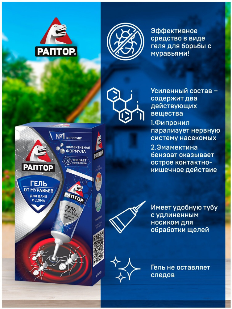 Раптор Гель от муравьевВ данный момент этот товар отсутствует в продаже. Возможно, у нас найдется аналогичный или похожий товар здесь. Принцип действия средства от муравьев в виде геля Раптор достаточно прост — он содержит вещества, приманивающие насекомых. После того как муравьи съедают гель или контактирует с ним, они становятся носителями отравляющего вещества. Активный компонент действует, как бомба замедленного действия: муравей возвращается в популяцию, где и погибает, успев заразить сородичей. Гель долго не сохнет и остается привлекательным для насекомых благодаря уникальной консистенции, удерживающей влагу. Удобный в использовании и высокоэффективный продукт можно использовать в квартире, потому что он не имеет запаха и не выделяет токсических веществ. |