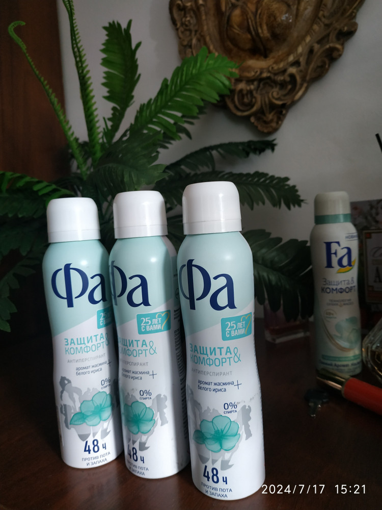 спасибо большое вам 👏🏼магазин🏢 Флип, я получила заказ 🛍️, когда получила заказ в пункте, сразу там открыли, смотрю не тот, здесь запах аромат жасмина и + белого ириса, Это антиперспирант мне понравилась, запах тот же нежный , в фотографиях сзади видно, мой антиперспирант Fa но он только с жасмином, а здесь с белым ирисом, Но принципе тоже запах тоже нежный сладкий , Главное мне нравится