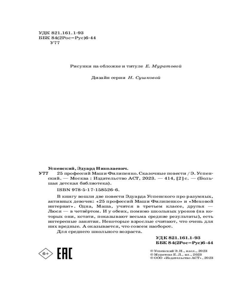 💳 Оплатить за товар можно при получении 🇰🇿 Есть бесплатная доставка по Казахстану от 1 дня 🎁 Копите бонусы с каждой покупки Серия: Большая детская библиотека В книгу вошли две повести Эдуарда Успенского про разумных, активных девочек: «25 профессий Маши Филипенко» и «Меховой интернат». Одна, Маша, учится в третьем классе, другая — Люся — в четвёртом. И у обеих, помимо школьных уроков (на которых они, кстати, показывают весьма средние результаты), есть интересные занятия. Некоторые взрослые считают, что очень для них вредные. А оказывается, что совсем наоборот. |