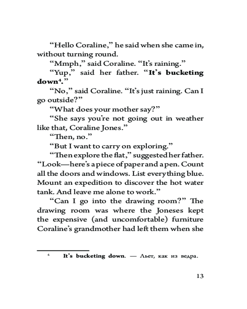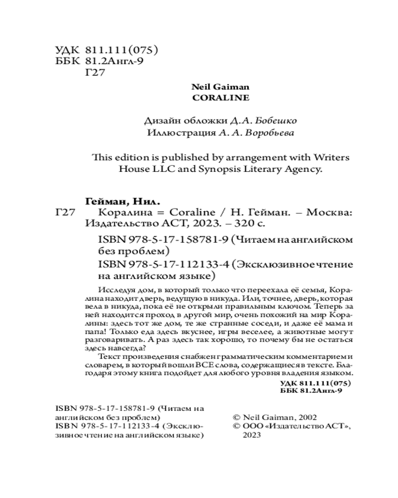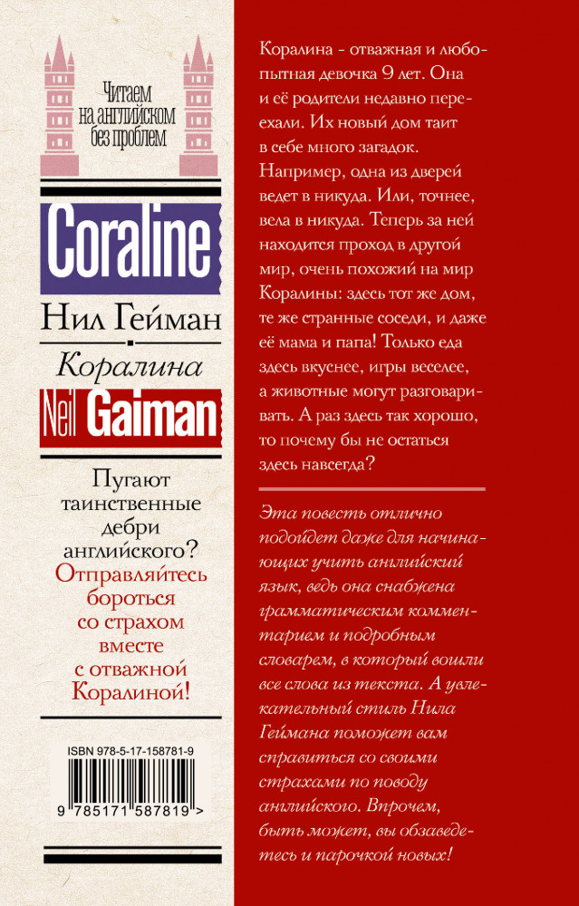 💳 Оплатить за товар можно при получении 🇰🇿 Есть бесплатная доставка по Казахстану 🎁 Копите бонусы с каждой покупки Серия: Читаем на английском без проблем Исследуя дом, в который только что переехала её семья, Коралина находит дверь, ведущую в никуда. Или, точнее, дверь, которая вела в никуда, пока её не открыли правильным ключом. Теперь за ней находится проход в другой мир, очень похожий на мир Коралины: здесь тот же дом, те же странные соседи, и даже её мама и папа! Только еда здесь вкуснее, игры веселее, а животные могут разговаривать. А раз здесь так хорошо, то почему бы не остаться здесь навсегда? |