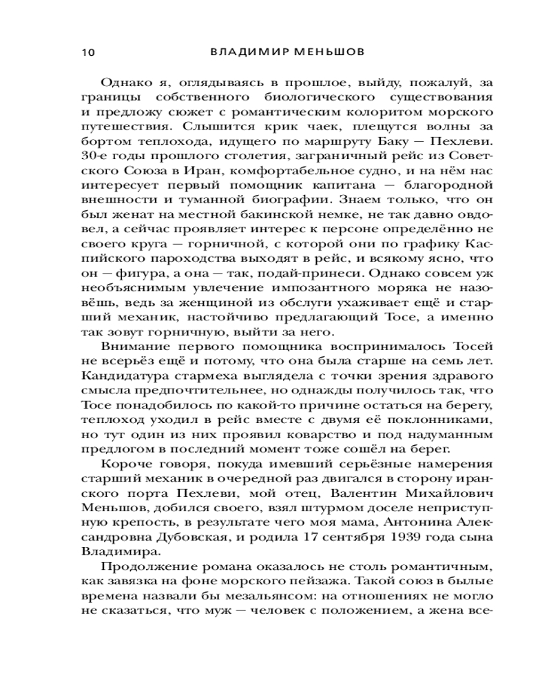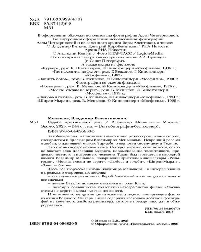 В данный момент этот товар отсутствует в продаже. Возможно, у нас найдется аналогичный или похожий товар здесь. Серия: Автобиография-бестселлер Автобиография, написанная знаменитым режиссером, киноактером, сценаристом и продюсером Владимиром Меньшовым. Искренний рассказ о любви, о настоящей мужской дружбе, верности своему делу и Родине.