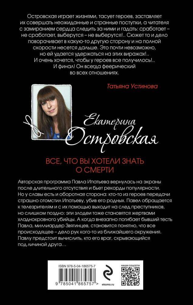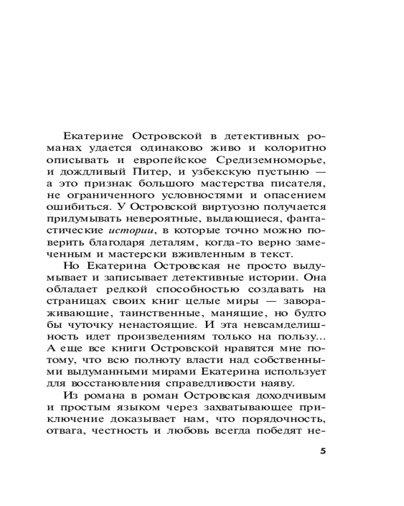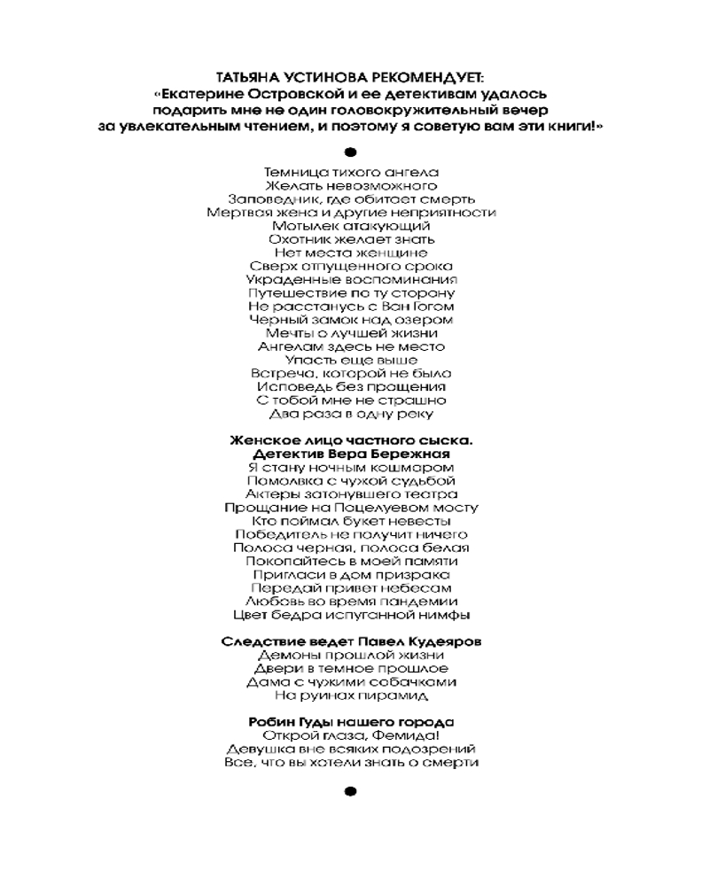 Татьяна Устинова рекомендует: «Екатерина Островская не просто выдумывает и записывает детективные истории. Она обладает редкой способностью создавать на страницах своих книг целые миры — завораживающие, таинственные, манящие, но будто бы чуточку ненастоящие. И эта невсамделишность идет произведениям только на пользу... А еще все книги Островской нравятся мне потому, что всю полноту власти над собственными выдуманными мирами Екатерина использует для восстановления справедливости наяву». |