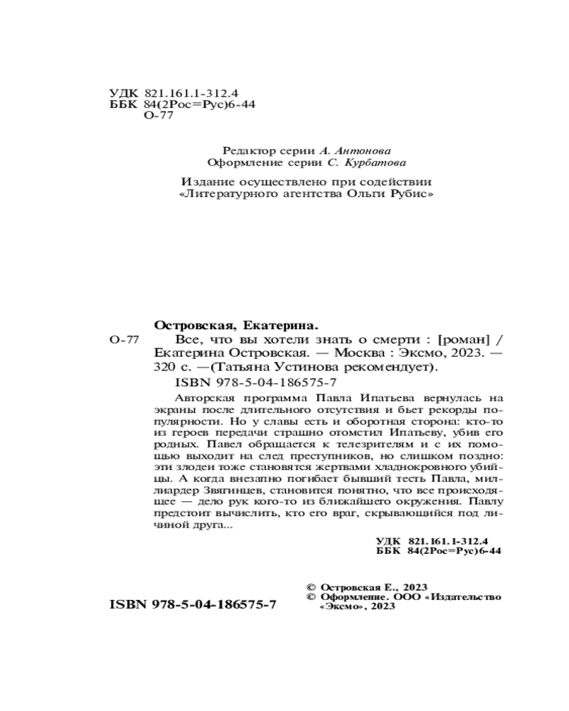 В данный момент этот товар отсутствует в продаже. Возможно, у нас найдется аналогичный или похожий товар здесь. Серия: Татьяна Устинова рекомендует Авторская программа Павла Ипатьева вернулась на экраны после длительного отсутствия и бьет рекорды популярности. Но у славы есть и оборотная сторона: кто-то из героев передачи страшно отомстил Ипатьеву, убив его родных. Павел обращается к телезрителям и с их помощью выходит на след преступников, но слишком поздно: эти злодеи тоже становятся жертвами хладнокровного убийцы. А когда внезапно погибает бывший тесть Павла, миллиардер Звягинцев, становится понятно, что все происходящее — дело рук кого-то из ближайшего окружения. Павлу предстоит вычислить, кто его враг, скрывающийся под личиной друга...
