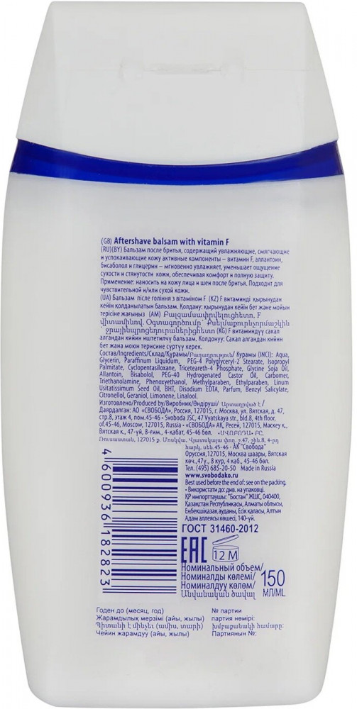 Svoboda Бальзам после бритья с витамином Fуценка +64 приятный запах жидкая консистенция легко вытекает быстро впитывается хороший объем