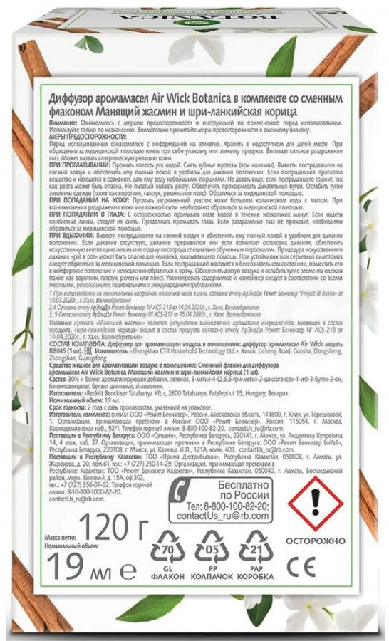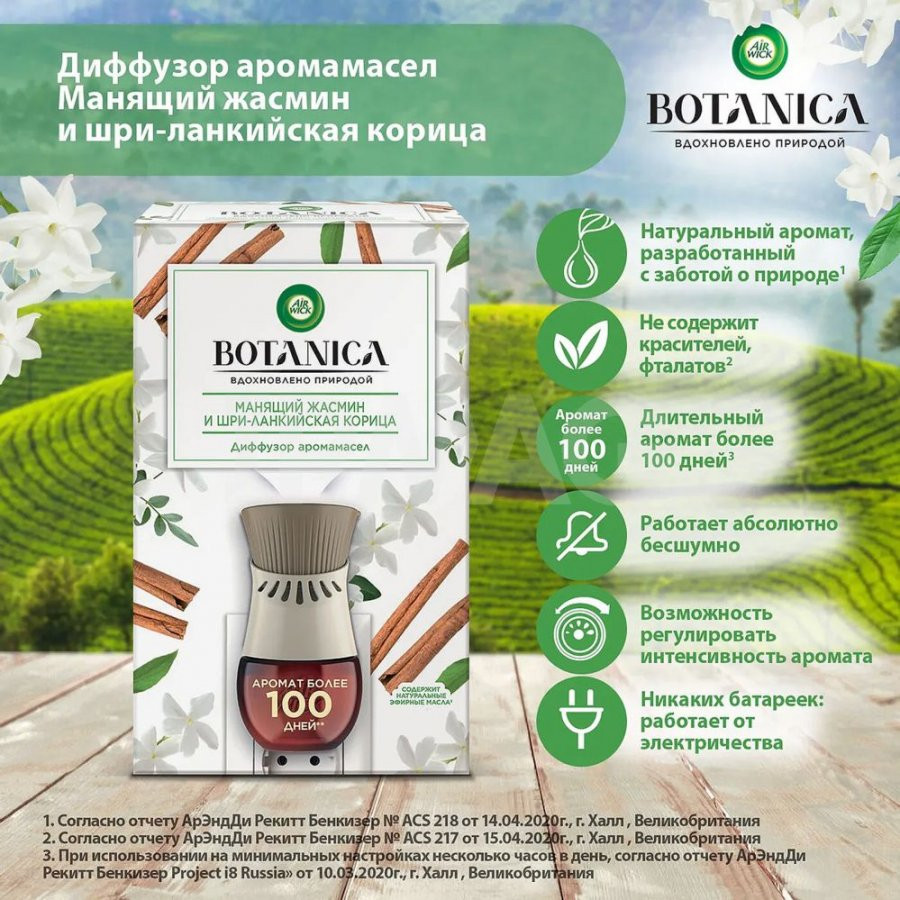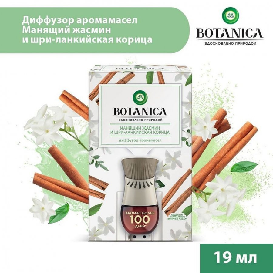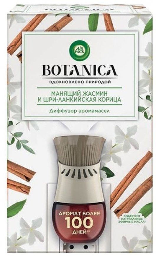 Ароматы Botanica изготовлены из натуральных ингредиентов, тщательно собранных с заботой об окружающей среде. Современный диффузор Air Wick Botanica наполнит дом длительным ароматом листьев шри-ланкийской корицы в сочетании с нежными нотками цветущего жасмина.