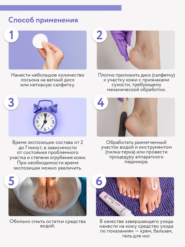 💳 Оплатить за товар можно при получении 🇰🇿 Есть бесплатная доставка по Казахстану от 1 дня 🎁 Копите бонусы с каждой покупки Лосьон создан специально для проведения процедуры педикюра максимально быстро и эффективно. Кератолитик размягчает ороговевший слой кожи, который можно легко удалить с помощью пилки-терки. Разработан специально для ухода за проблемами кожи ног: грубая и ороговевшая кожа, трещины, сухие натоптыши, мозоли. Также с помощью лосьона можно проводить профилактику наростов сухой ороговевшей кожи. Процедуру профилактики можно проводить в любое время года. Профессиональный объем отлично подойдет для салонов красоты. |