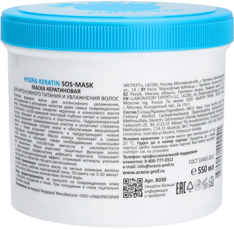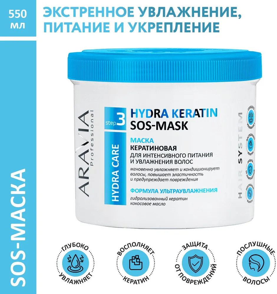 Aravia Маска для интенсивного питания и увлажнения волос кератиновая «Hydra Keratin SOS-Mask»+177 увлажняющая расчесывается мягкость волос