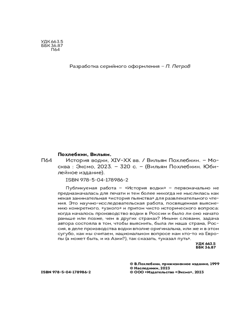 История водки. XIV-XX вв.В данный момент этот товар отсутствует в продаже. Возможно, у нас найдется аналогичный или похожий товар здесь. Серия: Вильям Похлебкин. Юбилейное издание «Решением международного арбитража 1982 года за СССР были бесспорно закреплены приоритет создания водки как русского оригинального алкогольного напитка и исключительное право на ее рекламу под этим наименованием на мировом рынке, а также признан основной советский экспортно-рекламный лозунг — «Only vodka from Russia is genuine Russian |