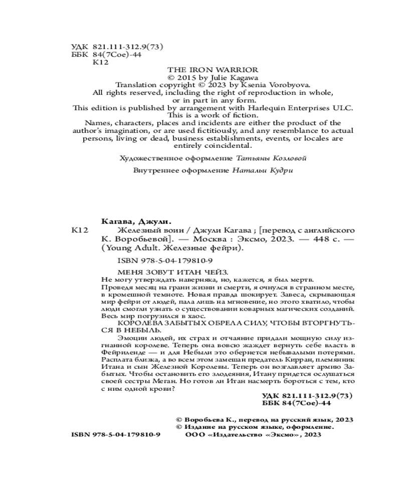 Стертая завеса между мирами, злосчастный амулет, предательства, новые приключения, война — Джули Кагава завершает свою серию о железных фейри невероятной кульминацией! Если ты ступаешь на опасную тропу, никогда не думай, что это в последний раз. Вскоре Итан понимает, что без его участия и Киррану, и Фейриленду грозит гибель. Но как быть, когда твой племянник — тот еще повеса, и полагаться нужно только на себя? |