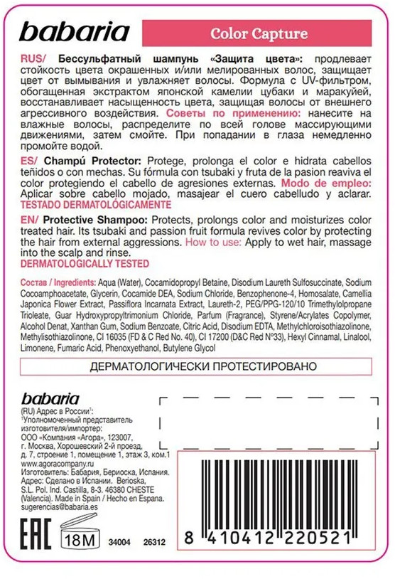 Babaria Шампунь для волос бессульфатный «Защита цвета»