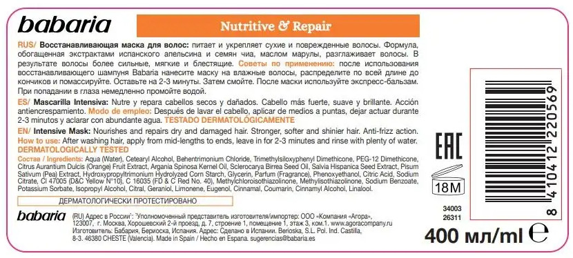 Babaria Маска для волос восстанавливающая