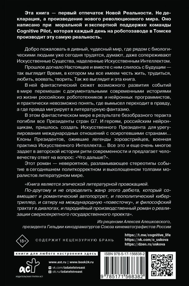 издание белая бумага содержание шрифт В данный момент этот товар отсутствует в продаже. Возможно, у нас найдется аналогичный или похожий товар здесь. Серия: Трансгуманизм fiction Эта книга — первый отпечаток Новой Реальности. Не декларация, а произведение нового революционного мира. Оно написано при моральной и экспертной поддержке команды Cognitive Pilot, которая каждый день на роботозаводе в Томске производит эту самую реальность.