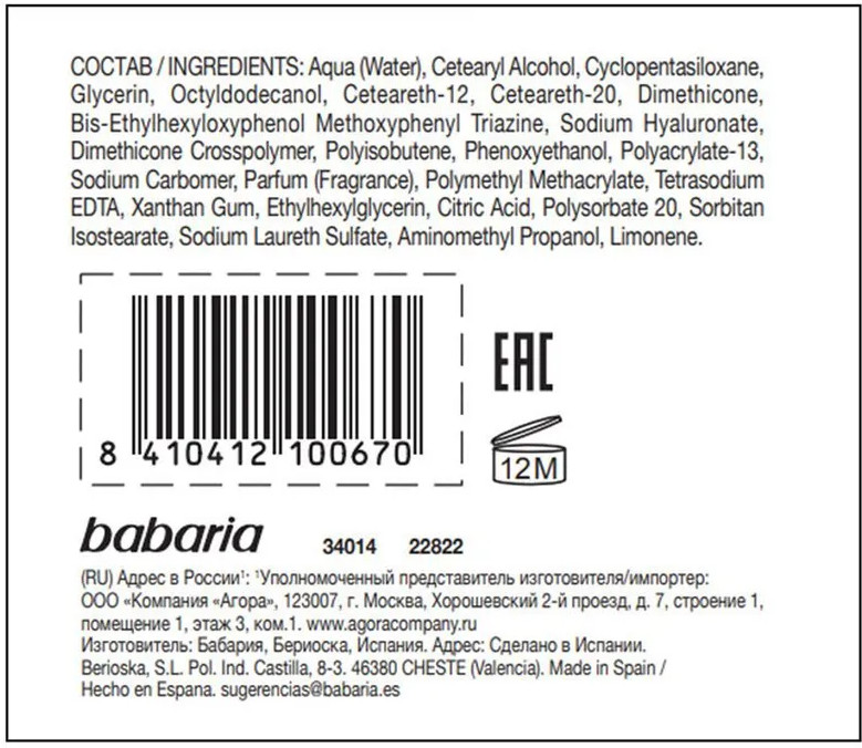 Babaria Крем для лица с гиалуроновой кислотой