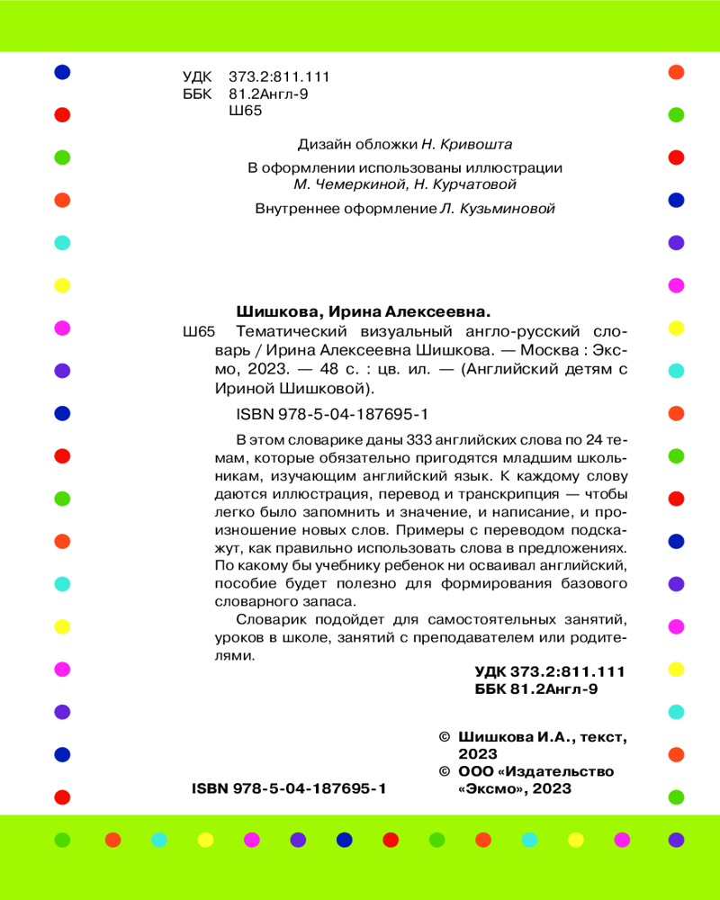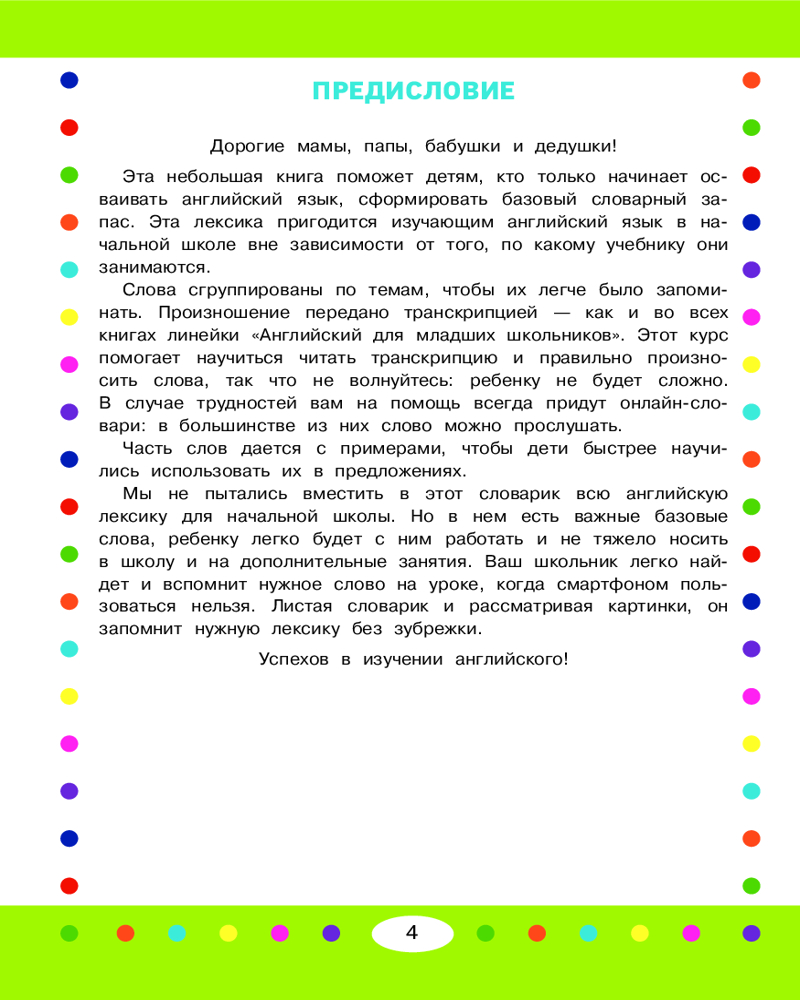 Тематический визуальный англо-русский словарьВ данный момент этот товар отсутствует в продаже. Возможно, у нас найдется аналогичный или похожий товар здесь. Серия: Английский детям с Ириной Шишковой Как запомнить английские слова, когда только приступаешь к изучению языка? Детям в этом помогут яркие иллюстрации! Разглядывая картинки и читая подписи к ним, легко запомнить и значение, и написание слов. Транскрипция подскажет, как правильно их произносить, а примеры с переводом научат использовать слова в предложениях. С этой маленькой книжкой ученики запомнят 333 слова по 24 темам, которые непременно пригодятся в начальной школе. Удобный формат словарика и мягкая обложка позволяют брать его на занятия, чтобы нужное слово всегда было под рукой. |