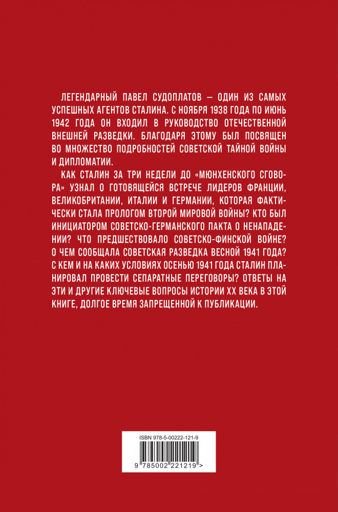 Хроника тайной войны и дипломатии. 1938-1941 годыВ данный момент этот товар отсутствует в продаже. Возможно, у нас найдется аналогичный или похожий товар здесь. Серия: Книга-эпоха Легендарный Павел Судоплатов — один из самых успешных агентов Сталина. С ноября 1938 года по июнь 1942 года он входил в руководство отечественной внешней разведки. Благодаря этому был посвящен во множество подробностей советской тайной войны и дипломатии. Как Сталин за три недели до «Мюнхенского сговора» узнал о готовящейся встрече лидеров Франции, Великобритании, Италии и Германии, которая фактически стала прологом Второй мировой войны? Кто был инициатором советско-германского пакта о ненападении? Что предшествовало советско-финской войне? О чем сообщала советская разведка весной 1941 года? С кем и на каких условиях осенью 1941 года Сталин планировал провести сепаратные переговоры? Ответы на эти и другие ключевые вопросы истории XX века в этой книге, долгое время запрещенной к публикации. |