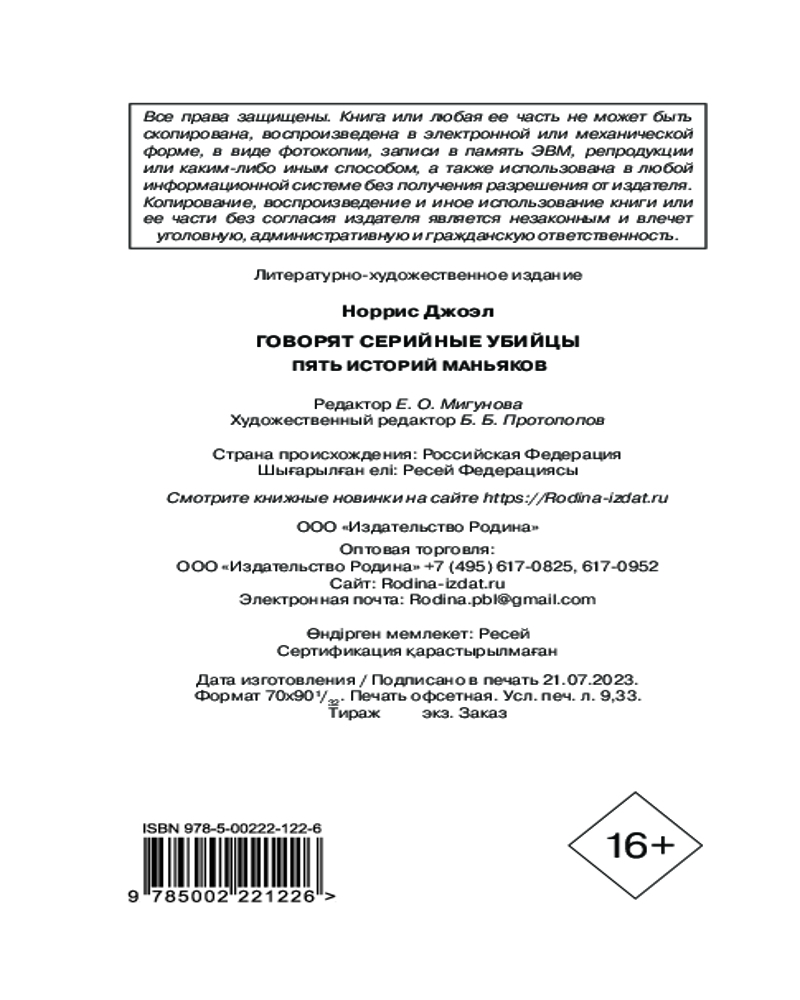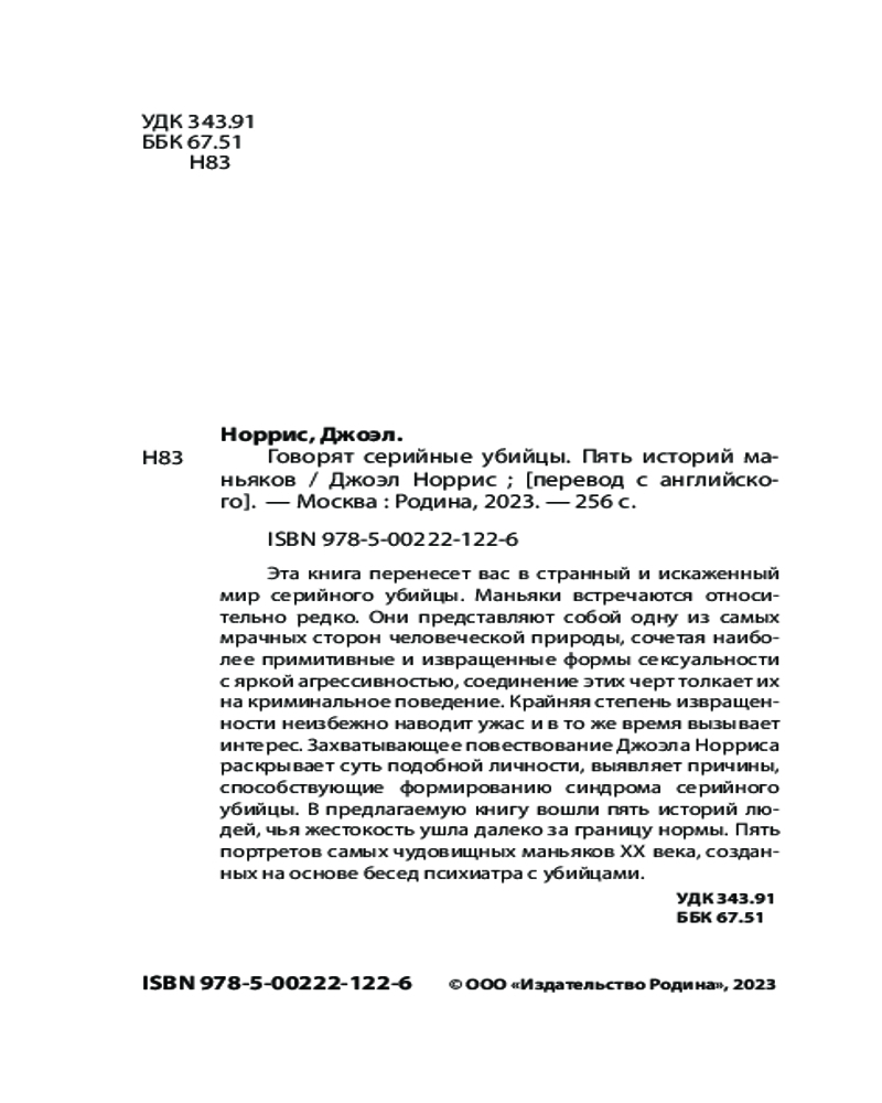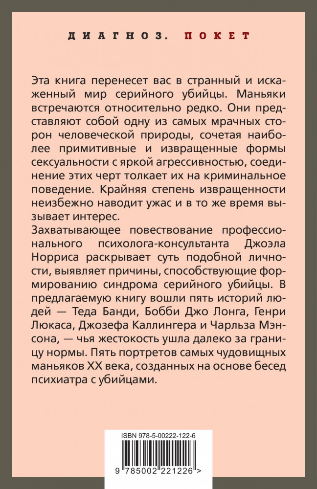 💳 Оплатить за товар можно при получении 🇰🇿 Есть бесплатная доставка по Казахстану от 1 дня 🎁 Копите бонусы с каждой покупки Серия: Диагноз. Покет Эта книга перенесет вас в странный и искаженный мир серийного убийцы. Маньяки встречаются относительно редко. Они представляют собой одну из самых мрачных сторон человеческой природы, сочетая наиболее примитивные и извращенные формы сексуальности с яркой агрессивностью, соединение этих черт толкает их на криминальное поведение. Крайняя степень извращенности неизбежно наводит ужас и в то же время вызывает интерес. |