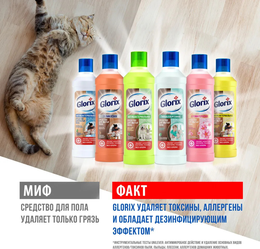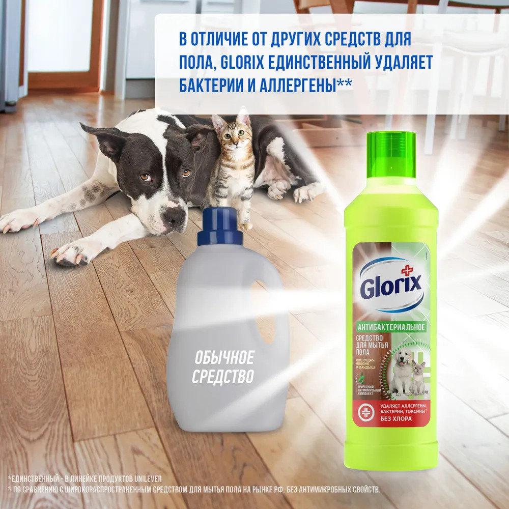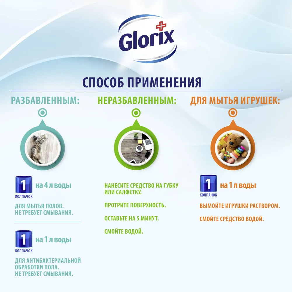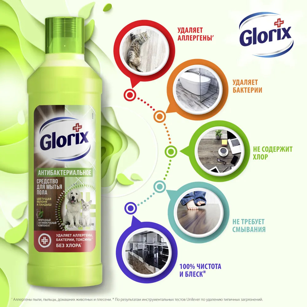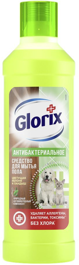 Жидкость для мытья пола Glorix «Цветущая яблоня» содержит в составе натуральные эфирные масла и бензалкония хлорид и помогает поддерживать блеск и чистоту любых поверхностей в доме. Glorix для пола не содержит спирт или хлор, мгновенно высыхает, не оставляет на полу мыльных разводов и не требует смывания. Глорикс для мытья полов эффективно борется не только с бактериями и грязью, но и с аллергенами, что крайне актуально в весенне-летний период или если дома есть животные. Жидкость Глорикс безопасна для детей и домашних животных. Glorix подходит для очищения различных поверхностей: столов, стульев, мебели, сантехники и даже игрушек. Чистящее средство Glorix для мытья пола может использоваться для любых покрытий: ламината, линолеума, деревянных полов, паркета.