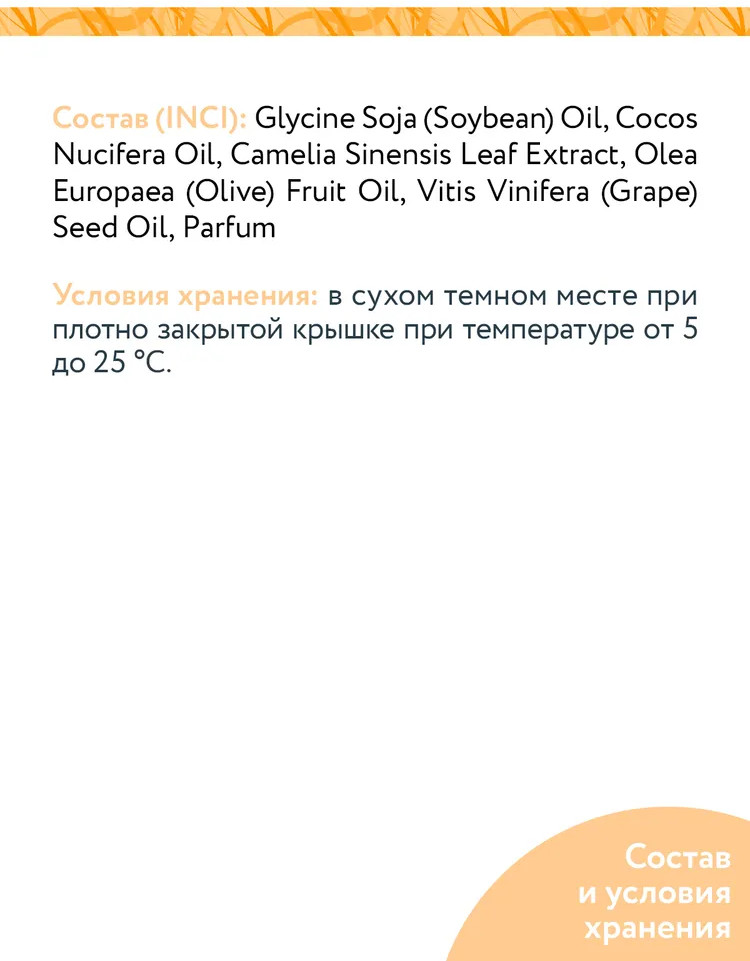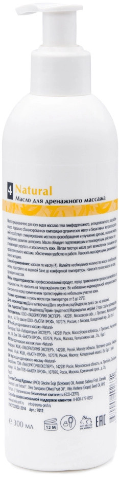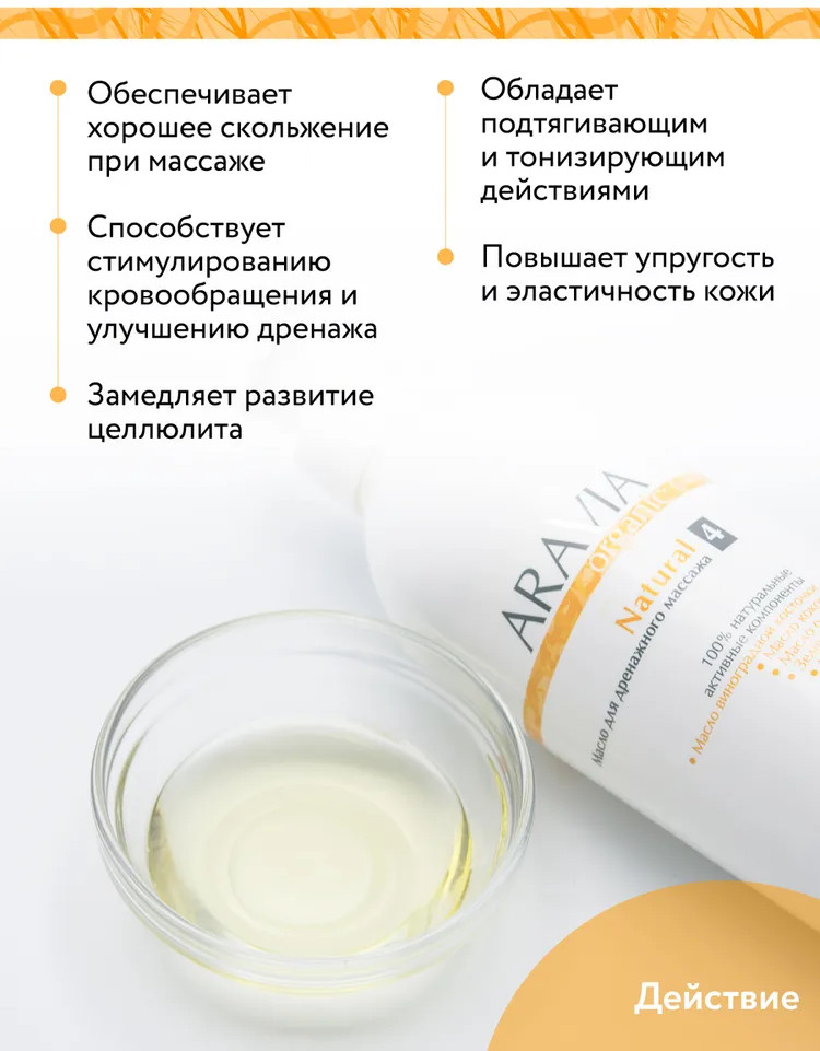 Масло предназначено для всех видов массажа тела лимфодренажного, антицеллюлитного, расслабляющего. Идеально сбалансированная композиция органических масел виноградной косточки, оливы и сои, и биоактивных экстрактов растений способствует стимулированию местного кровообращения и улучшению дренажа, сжиганию жиров, замедлению развития целлюлита. Масло обладает подтягивающим и тонизирующим действием, восстанавливает упругость и эластичность кожи. Лёгкая текстура масла даёт великолепное скольжение для продолжительного массажа, обеспечивая удобство в работе.