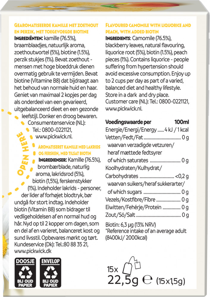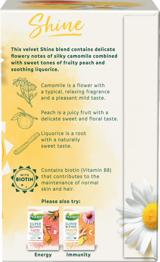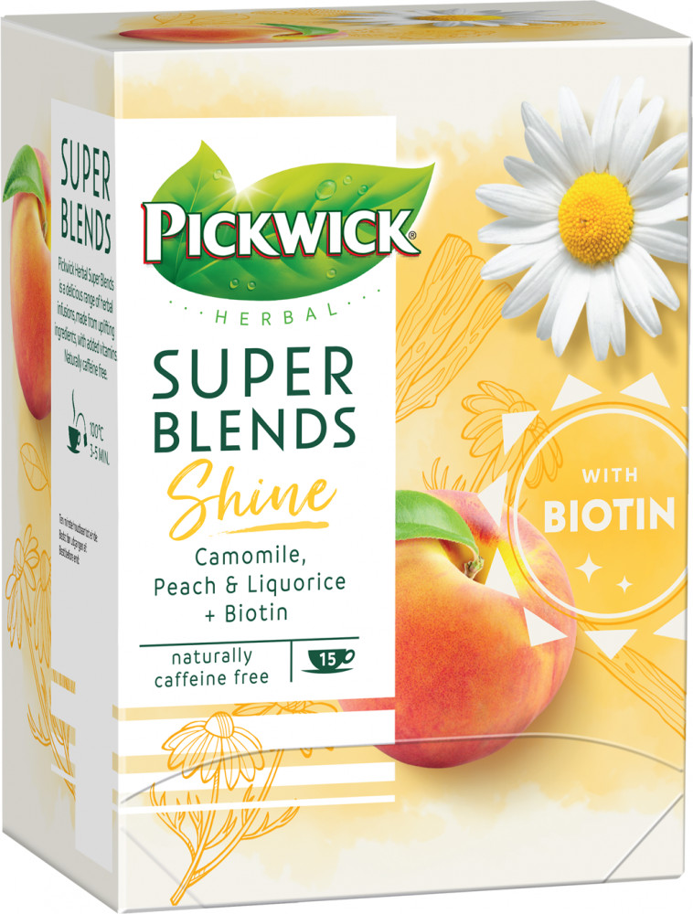 Pickwick Чай травяной «Super Blnd Shine»В данный момент этот товар отсутствует в продаже. Возможно, у нас найдется аналогичный или похожий товар здесь. Травяной чай Pickwick Super Blends Shine обогащен биотином (витамин В8), поддерживающим состояние кожи и волос. Насыщенный вкус, без кофеина. Чай с ромашкой, листьями ежевики и добавлением ломтиков персика. |